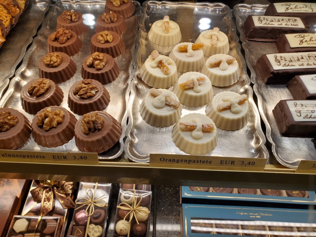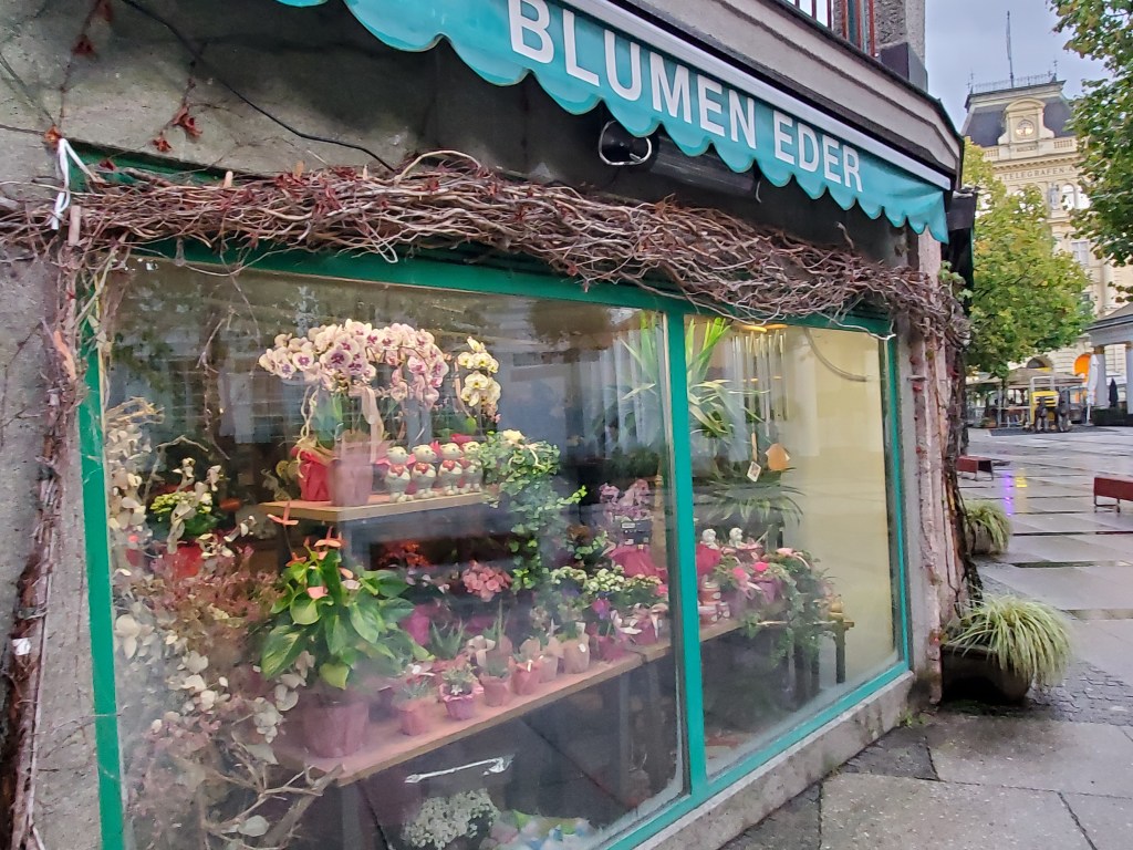 The rain finally turned to a drizzle around 4:30 p.m. so we went out to see the sites and to look for food, first stopping at a recommended restaurant on the esplanade by the river, Zauners, established in 1832. It really was a nice place, but the first seat we chose was by a wall of mirrors. My back was against that wall and Betsy was facing it and she realized a lot of flies liked that wall…a lot of flies. We asked to move. It’s that time of year with rain and humidity and the nice restaurants keep some doors open, so we didn’t freak out. We just opted to sit somewhere else.