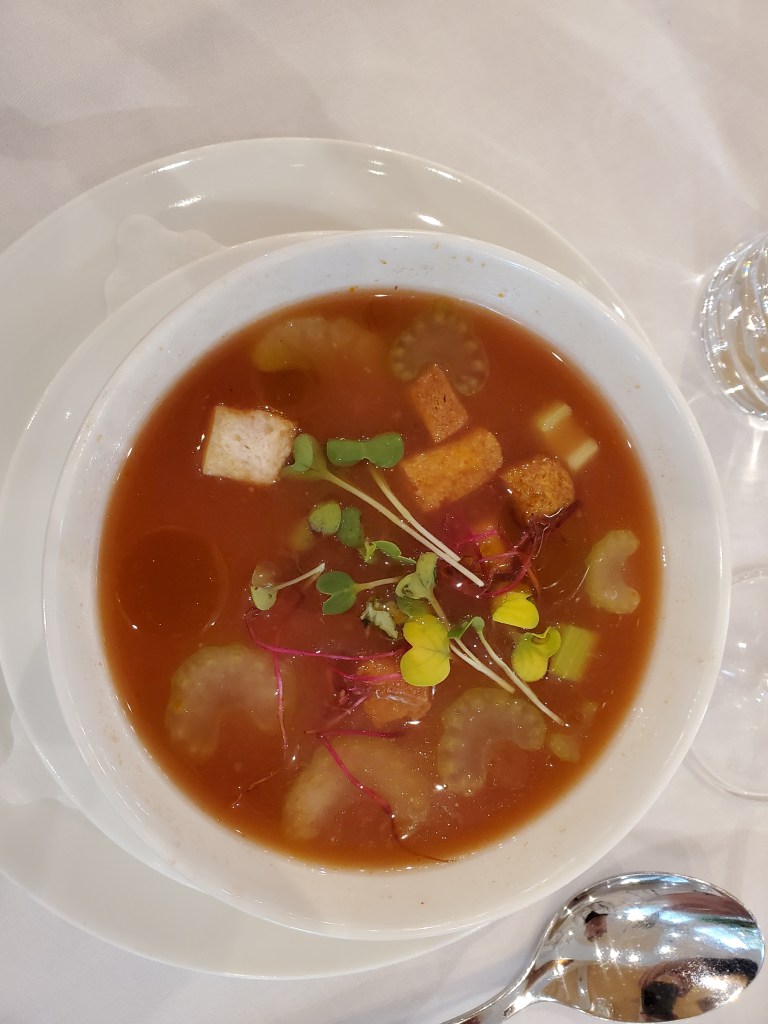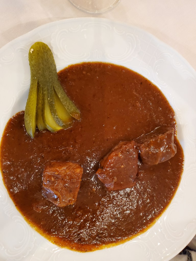 We thought it would be fun to eat a snack in one place and then move on. Betsy ordered the gazpacho, which was not the typical salsa-like gazpacho. It was soupy with thin slices of celery and she said it was the best ever, full of flavor. I ordered a small portion of goulash, just three small bits of beef with some of that fabulous gravy. The beef was dry, but the gravy/sauce was delicious.