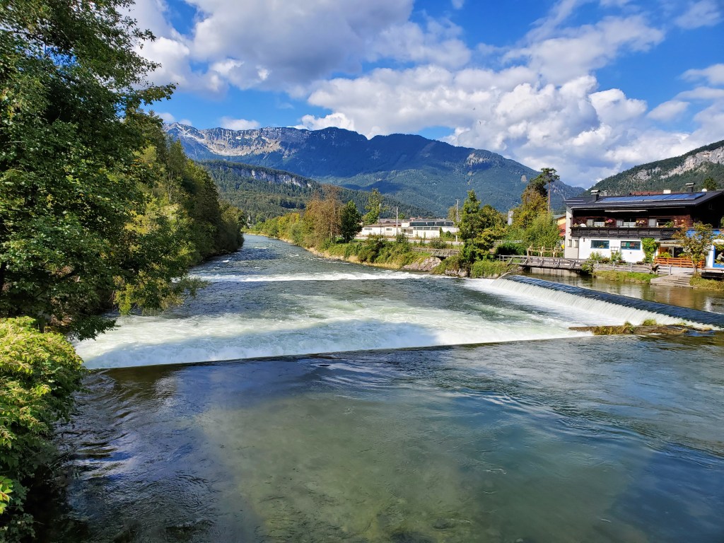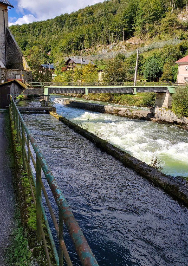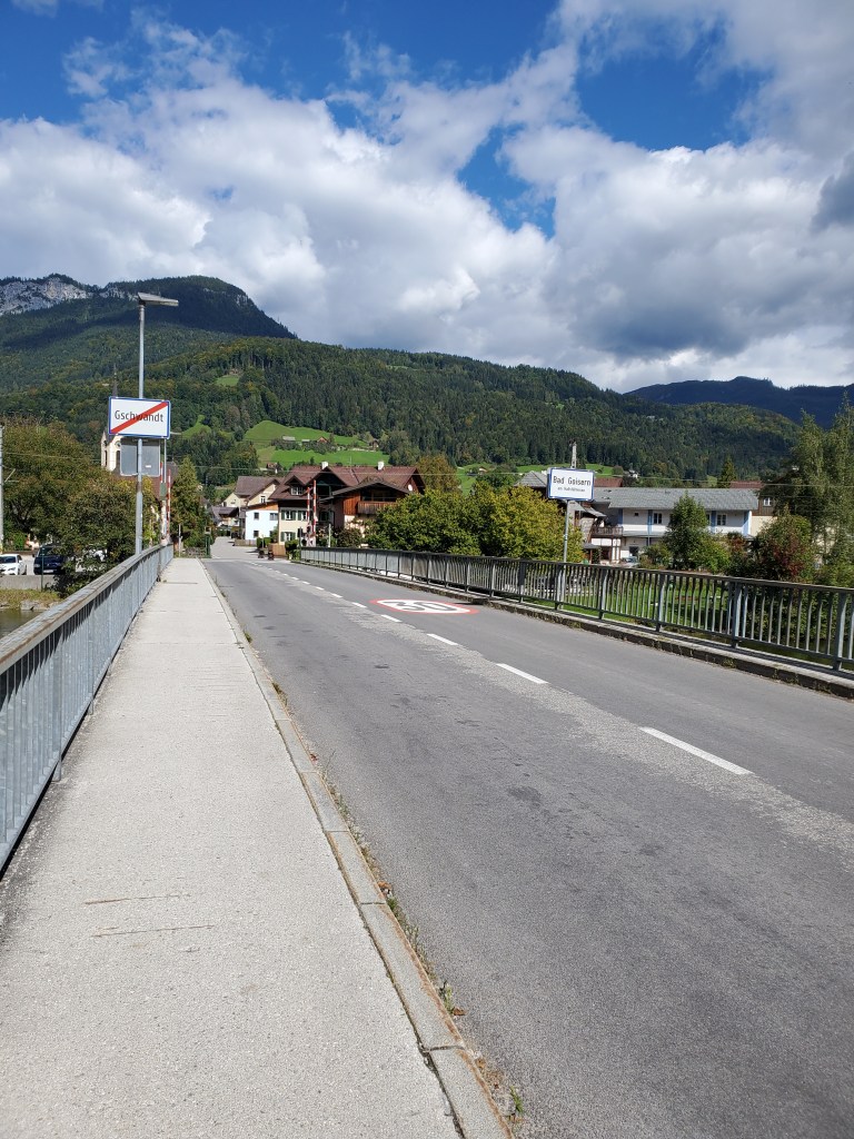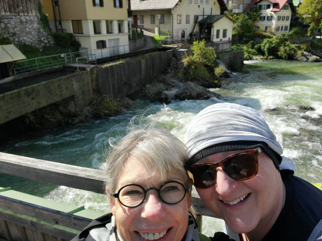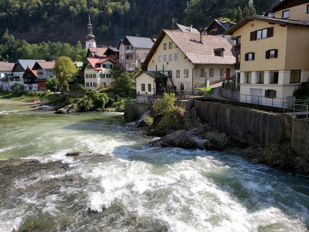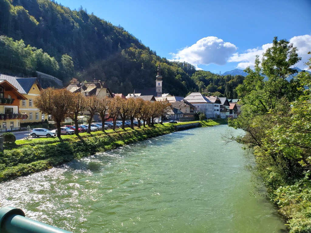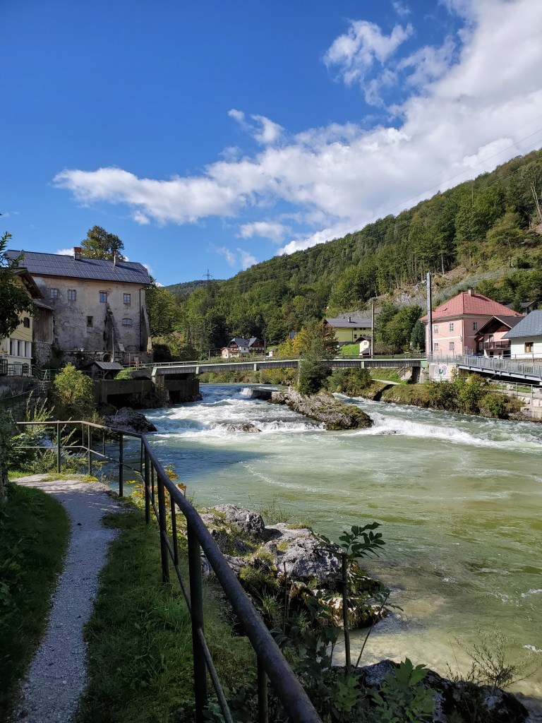 The sun shone on us all day today and it was magnificent. It was cold at first, low 40s, when we set out, but the day got warmer and warmer and so did we. We left Bad Ischl and walked along the river and by a children’s playground.