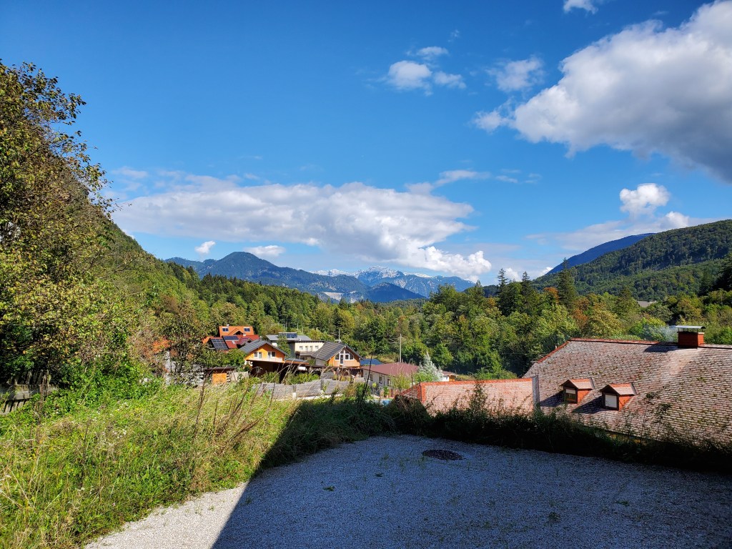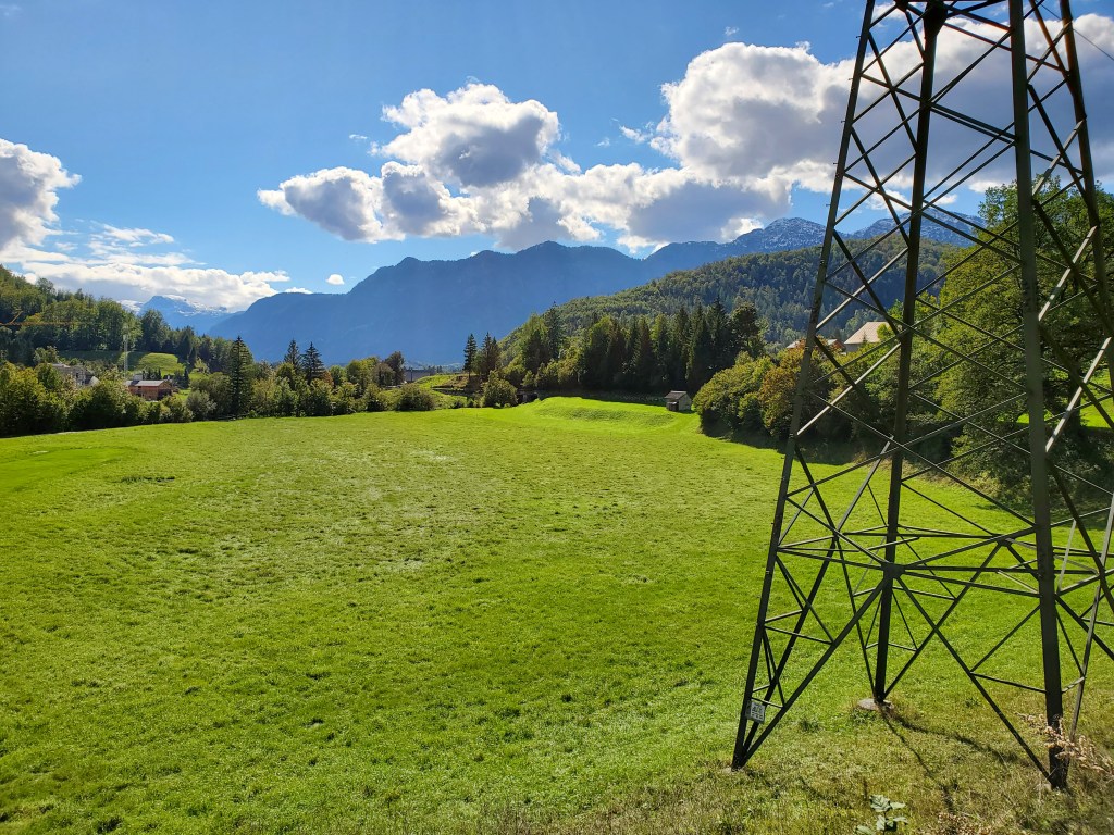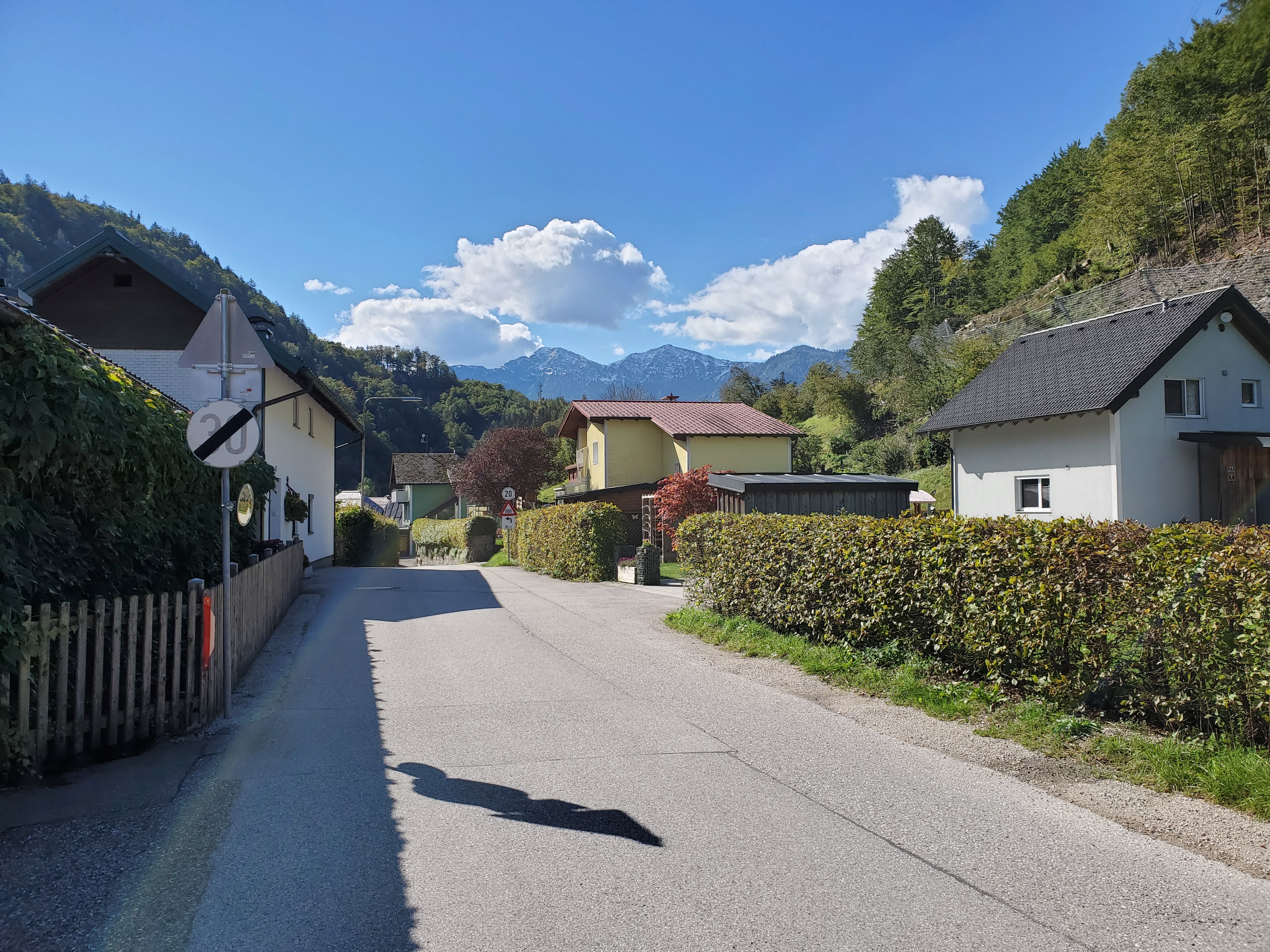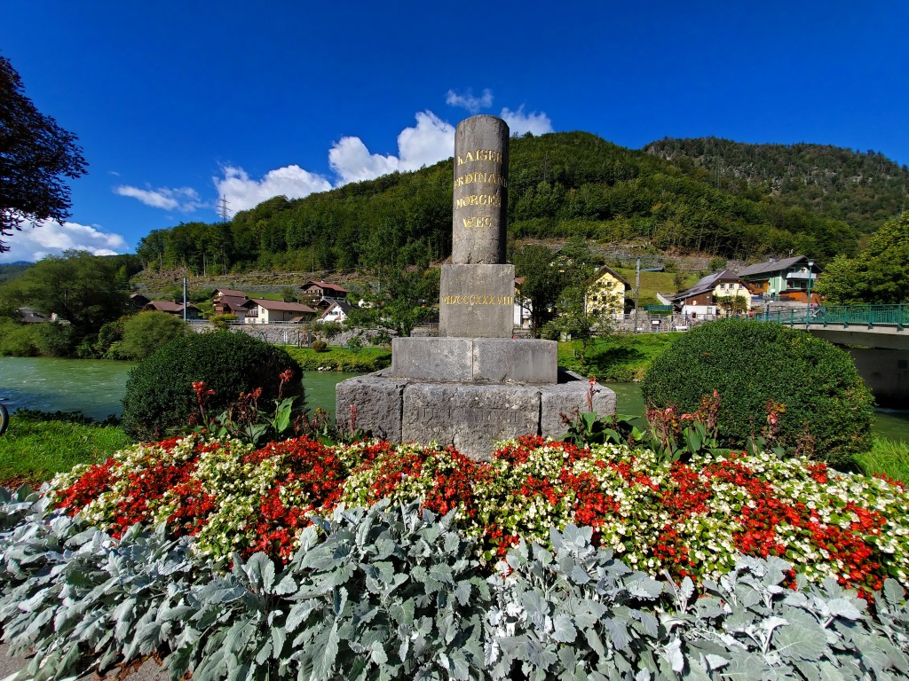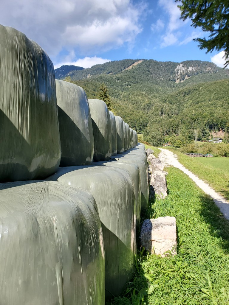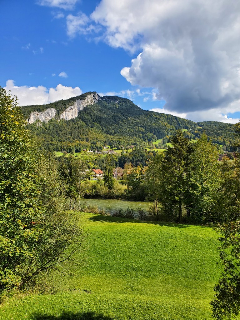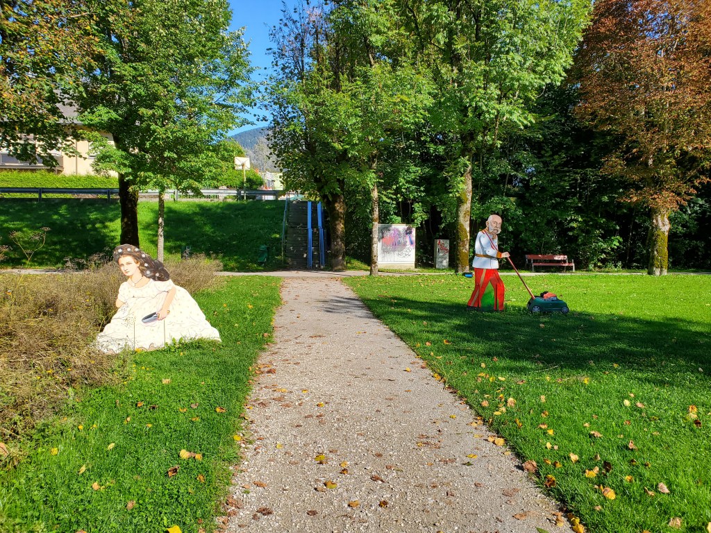 The sun shone on us all day today and it was magnificent. It was cold at first, low 40s, when we set out, but the day got warmer and warmer and so did we. We left Bad Ischl and walked along the river and by a children’s playground.