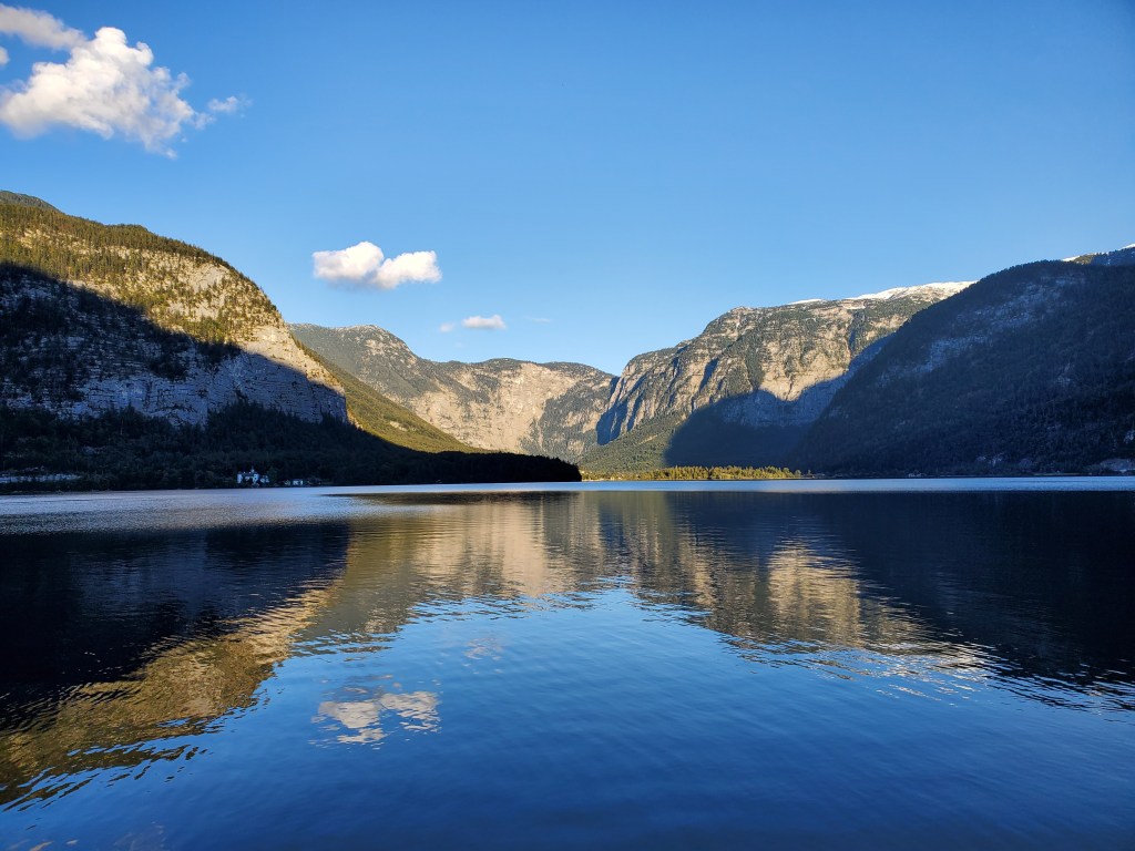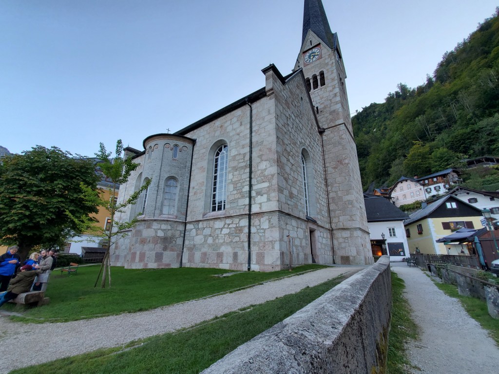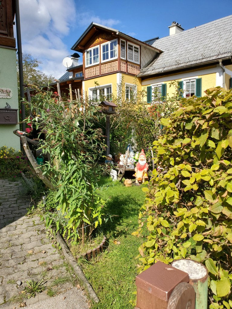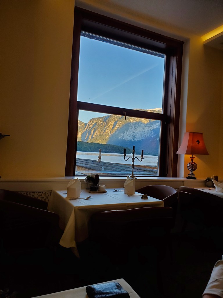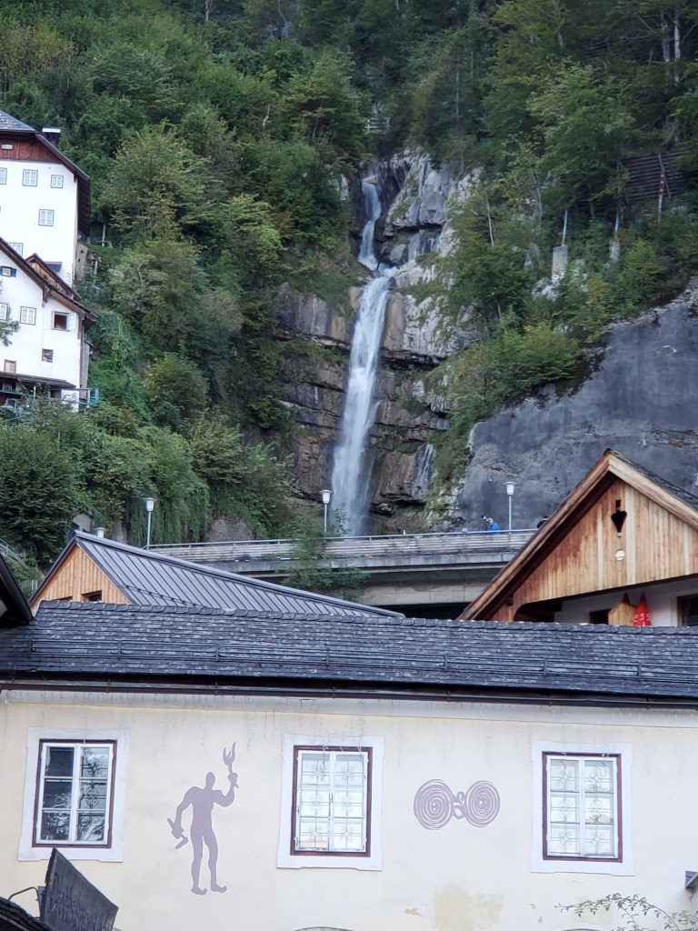 Hallstatt is still going strong with tourists, mostly daytrippers who leave by bus around 6 p.m. We overheard a lot of people talking and know we aren’t the only Americans here. There are also a lot of visitors from Asia and Middle East as well as throughout Europe. Hallstatt is a highly desirable place to visit and therefore is threatened by over-tourism. At least 10,000 people come here each day, pushing its resources to the limit. Yes, we know w’ere part of the problem, but we didn’t realize it until we arrived. Until 1960, it was a sleepy village only accessible by boat. The road/tunnel system was constructed and that led to the first influx of tourism. Over the years, the tourism numbers have increased dramatically. It’s no wonder because it looks like a fairy tale village. There’s talk among city leaders of setting limits on how many tourists can visit each day. For us, after 6 p.m., the streets were mostly quiet with just a few people eating in restaurants.