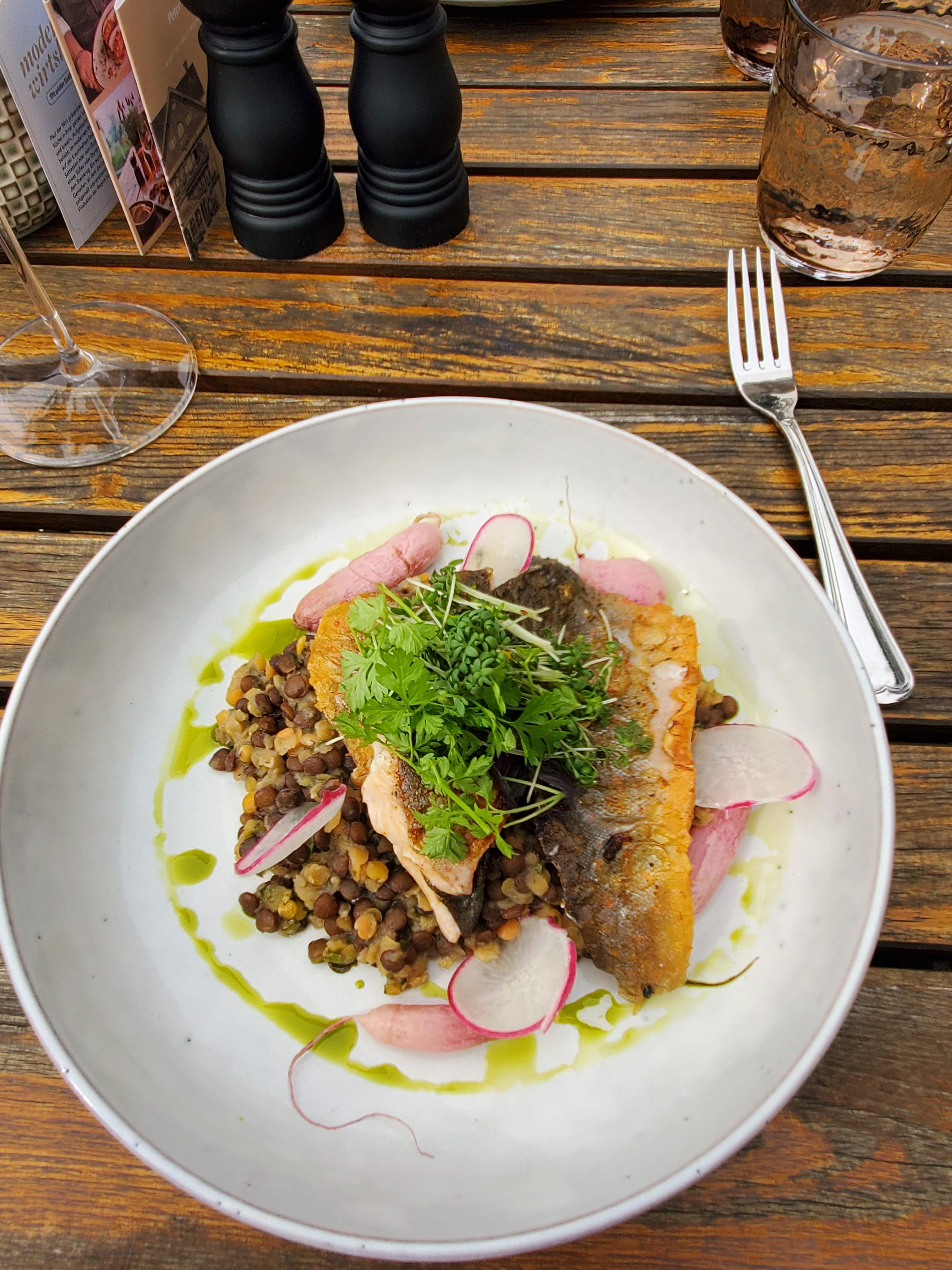As we entered the village, we saw a restaurant with strategically placed outdoor tables and a wonderful view, so we took a seat for lunch. We both ordered an appetizer size salad with local feta cheese and lots of greens and sprinkled with rhubarb, cranberries, nuts and strawberries and dressed with an apple balsamic vinaigrette. It was delicious. Betsy ordered ravioli, which came with a lot more salad, and I ordered the grilled char filet and lentils. Mine was delicious. Hers was a little disappointing as the ravioli was made of wonton wrappers and fried. Plus, she didn’t expect another salad, though that’s certainly a healthy surprise. And it had some more of those juicy little tomatoes!
