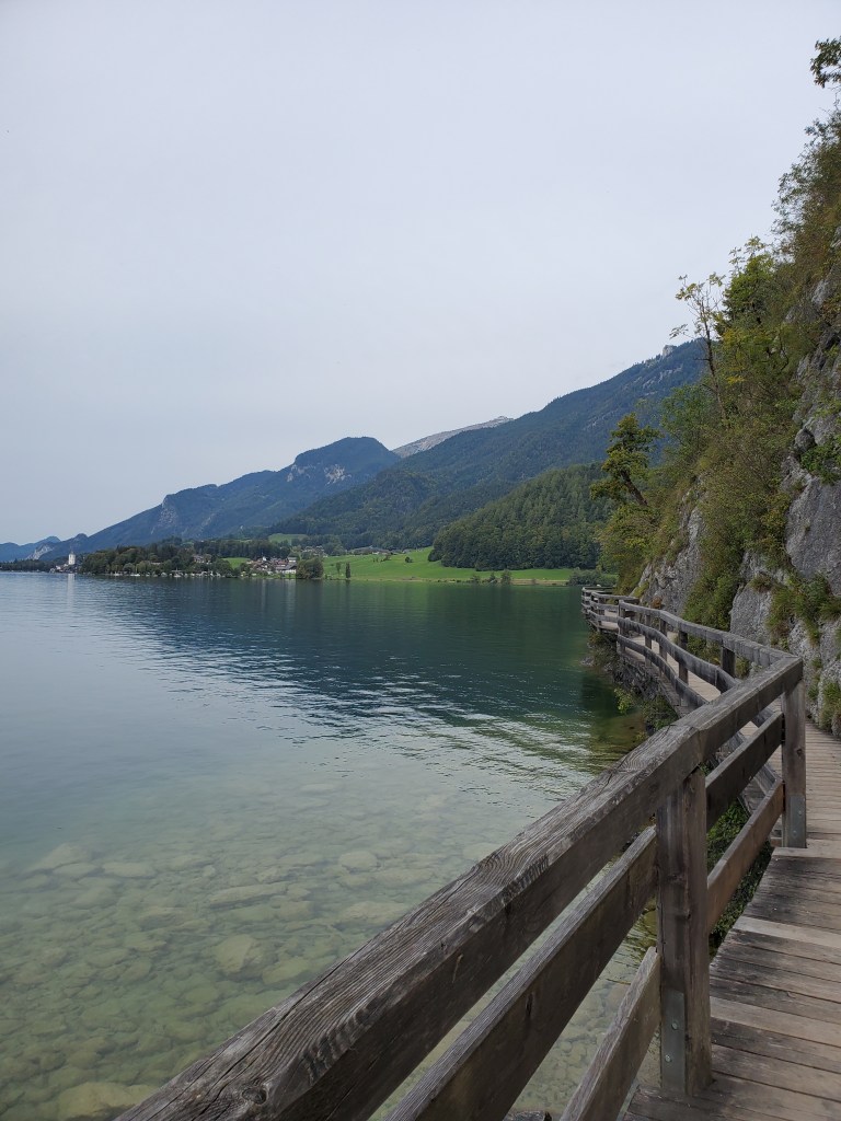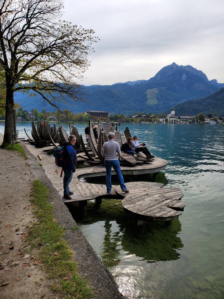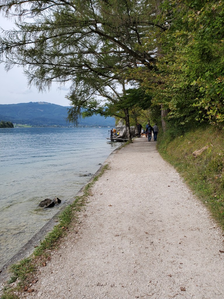 Finally, a bus came that we could board, but it was going to require at least two bus changes and another couple of hours of waiting time. It was 11 a.m. and we were anxious to get across, or through, the mountain and to our walk. It took a while to board because most people buy tickets from the driver, plus there is a lot of confusion about which bus and a lot of languages being spoken. We were in the line to get on when a second taxi pulled into the lot and dropped someone off. I stepped out of line and walked over and asked what he would charge to take us to Bad Ischl. From there, we could catch the bus to Strobl (places we’ve been already, but the route is different today). He told me the price and I called to Betsy just before she was stepping up on the bus and we both climbed into the taxi. I could feel the eyes of the crowd on us and one guy came and asked if he could ride along to the train station, but that was the opposite direction from where we were going. Plus, the whole problem with the bus situation is that work is underway on the train track so some stations are closed.