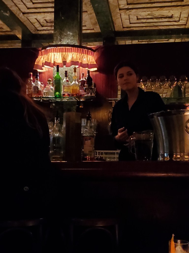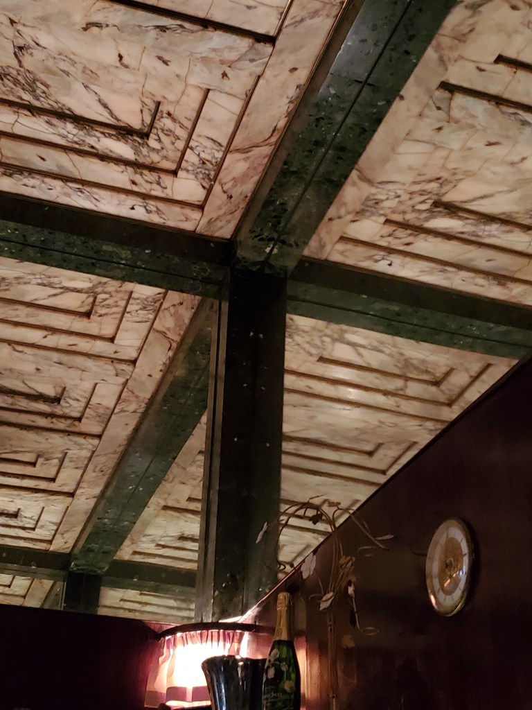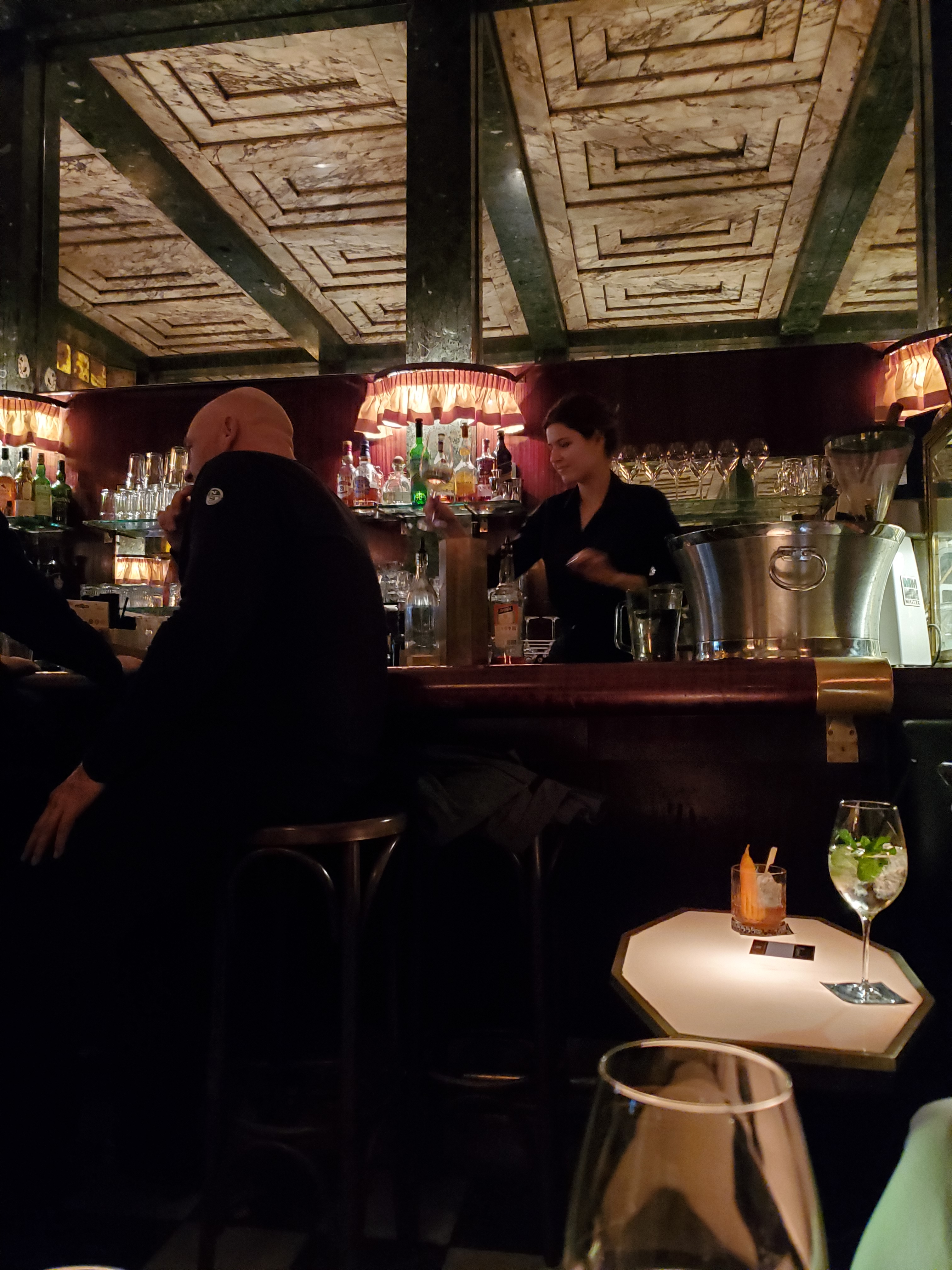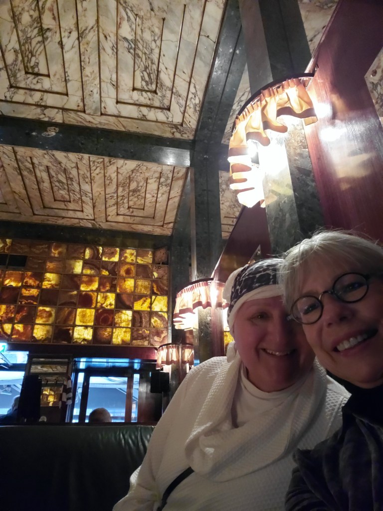 Next stop was the infamous Loos Bar, a tiny but pretty spot just off of the main shopping street. Officially named The American Bar, it was designed by architect Adolf Loos in 1908. It is an elegant setting with marble, onyx and mahogany. With two booths and bar stools, there are seats for maybe 15 people. We enjoyed our time there. Come to think of it, we earned a strong A in bar hopping.