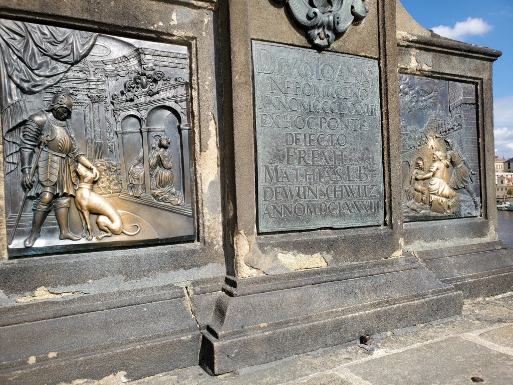 Charles Bridge is lined with several statues of Czech patron saints, including this one of St. John of Nepomuk, a 14th Century priest. The queen confessed her secrets to him and legend has it that the king had him killed for refusing to reveal those secrets. Today the tradition is to touch the plaque and make a wish. We hope ours come true.