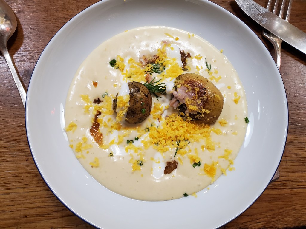 Back on a tram, we arrived at our last stop, Ezka, a gorgeous open-kitchen restaurant and bakery located in a former industrial space where boilers were produced. We tried their famed burnt potato dish surrounded by a creamy potato sauce and topped with dehydrated grated egg yolk and bit of smoked carp – yes, carp. It did not taste fishy, but just added some smoky umami to the dish. It was excellent.