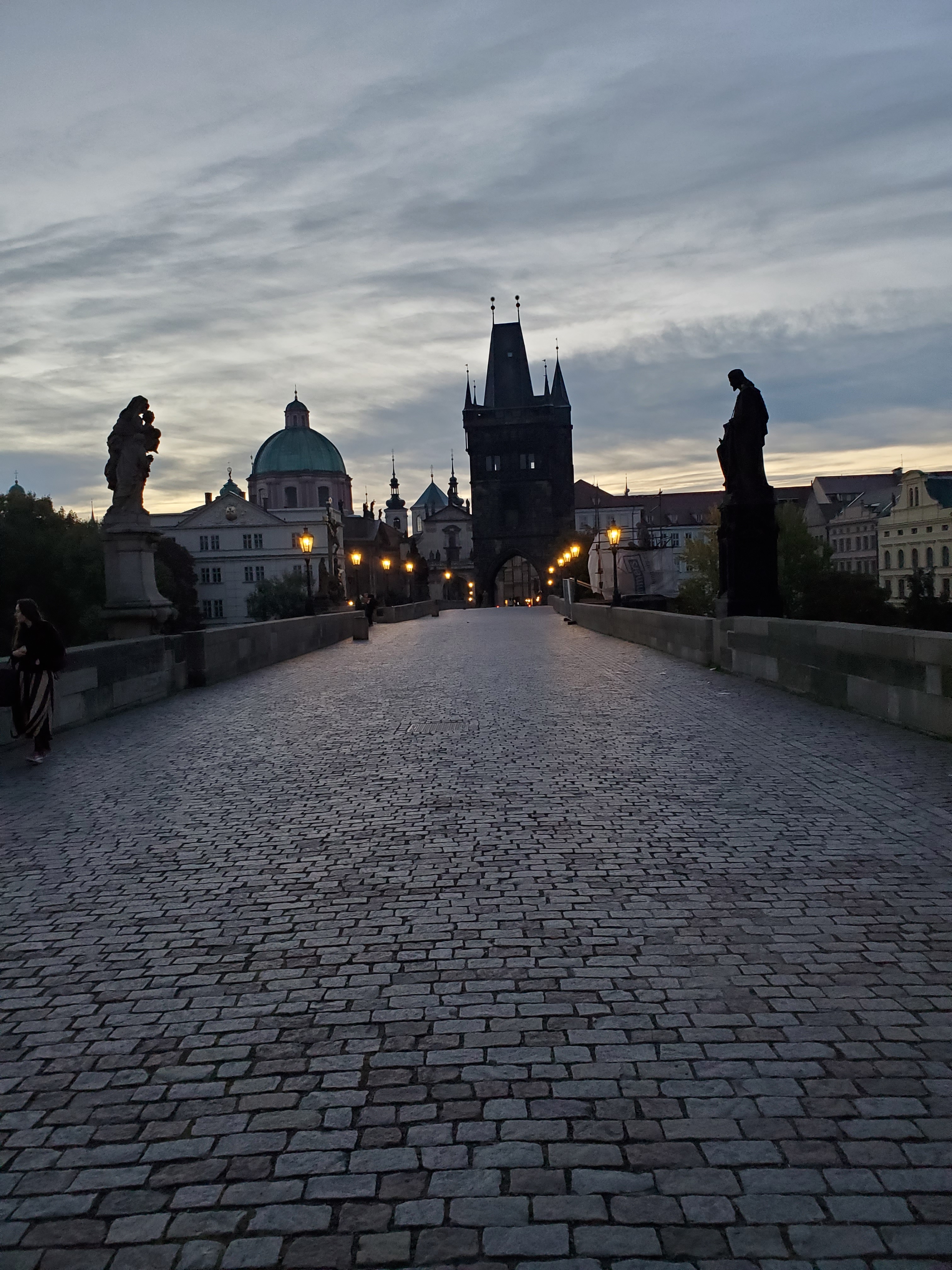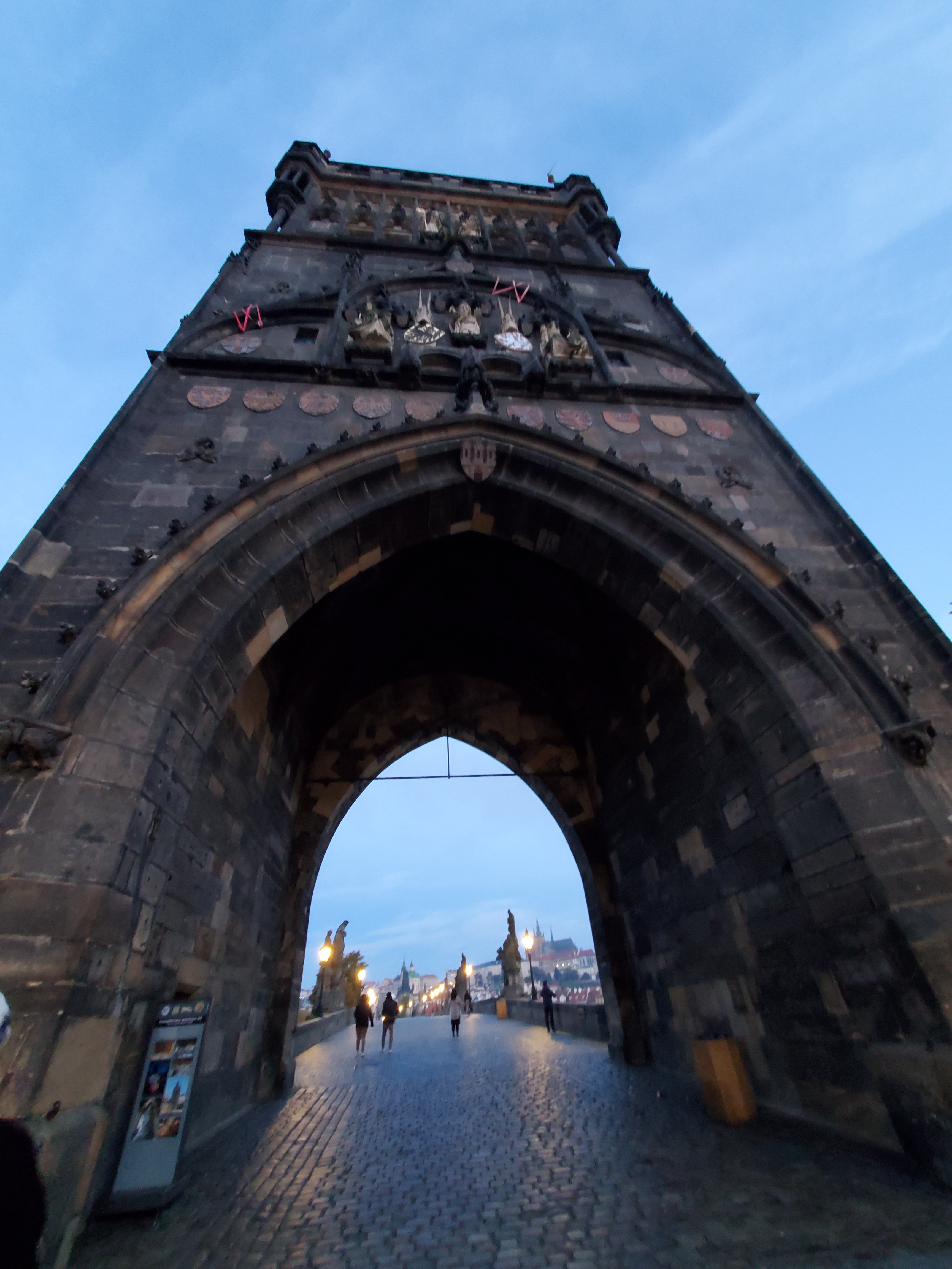 We were out of the apartment around 6:30 making our way through Old Town. It was great to see it at that time of day, just starting to wake up but really quiet and empty. We were the only ones on the streets – streets that were teeming with people just a few hours later. The bridge did have a few people, some jogging and some waiting on the sunrise like us. A few hours later, hundreds of people were strolling the bridge.