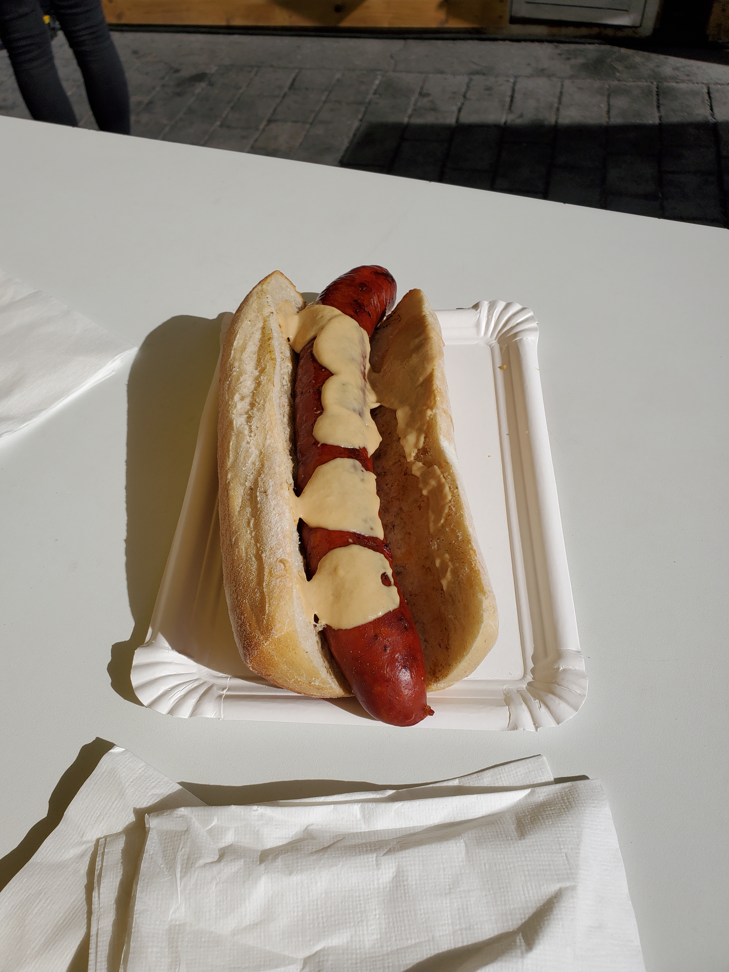 As noon approached, street carts were beginning to serve food. We didn’t want to eat much since we had reservations for the food tour, so we split a paprika-forward frankfurter. I’m not a hotdog fan at all, but this was pretty good. It didn’t have that bologna taste that I don’t like and it was grilled kind of crispy. The mustard was muted, and the bun was fresh.