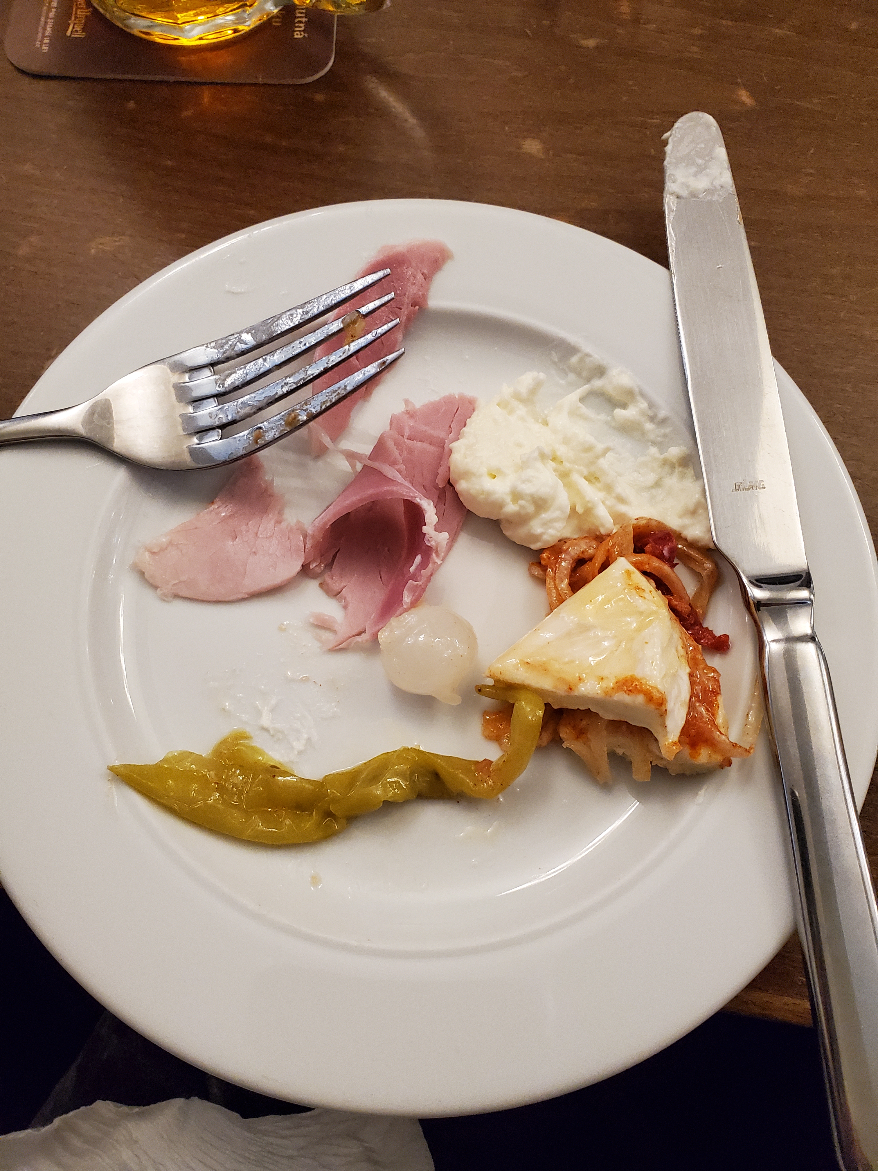 Back home again to rest a bit and then meet the guide for the food tour. The Prague Foodie Tour from Taste of Prague lived up to and exceeded its 5-star Tripadvisor reputation. Our guide, Anna, was delightful, knowledgeable, funny and just perfect. The Taste of Prague website describes her as a “food nerd,” in the best possible way. She shares stories about food and the role it has played in Czech history and culture – but she knows just as much about the current trends in food in Prague and the country and is able to tie all of that history to the innovative dishes being developed by today’s chefs. Prior to this experience, we thought of Czech food as heavy, and a lot of it is, but some really talented chefs and creative restaurants have put their own twists on those traditional staples and also created entirely new dishes that are wowing locals and tourists.