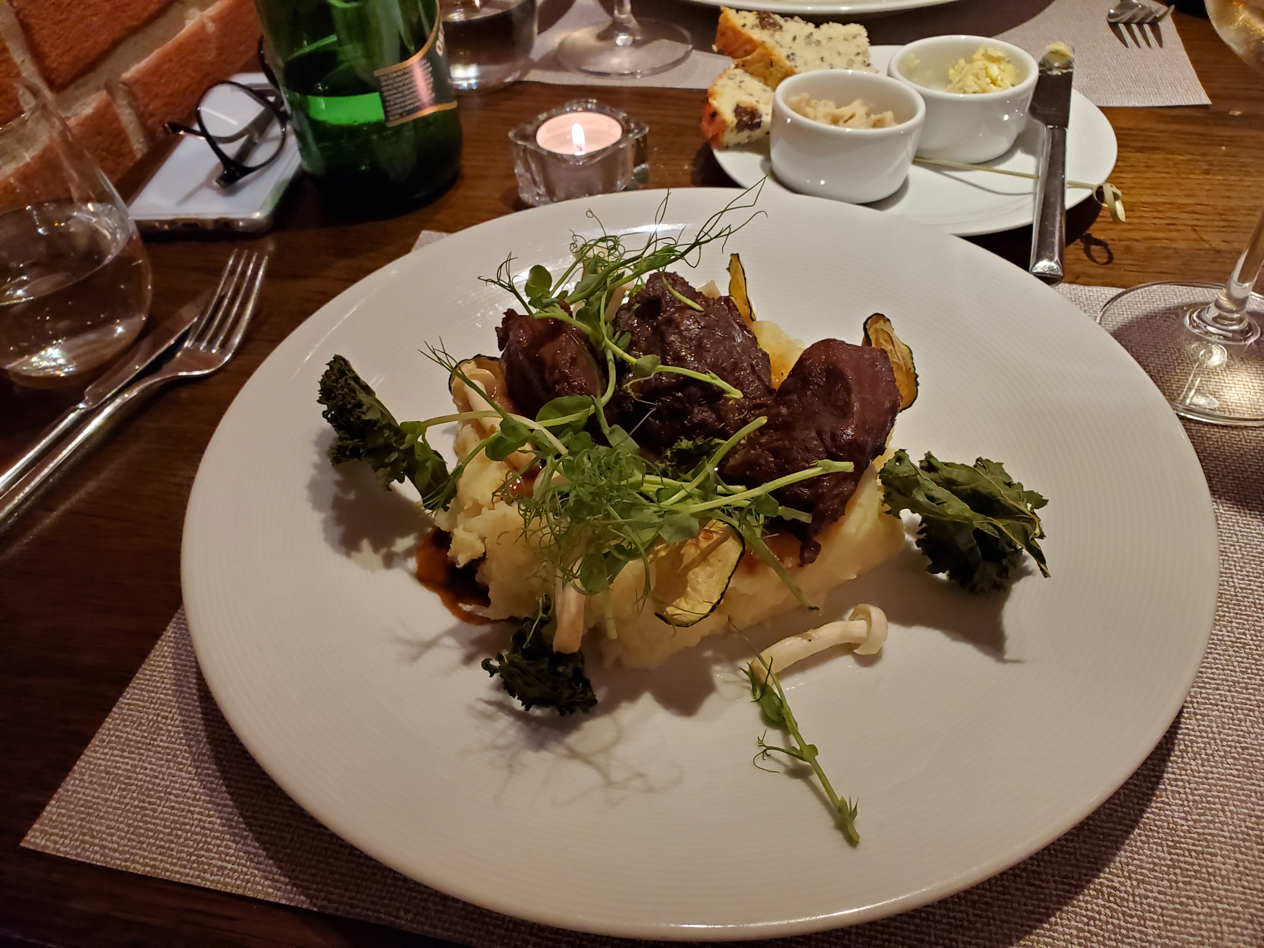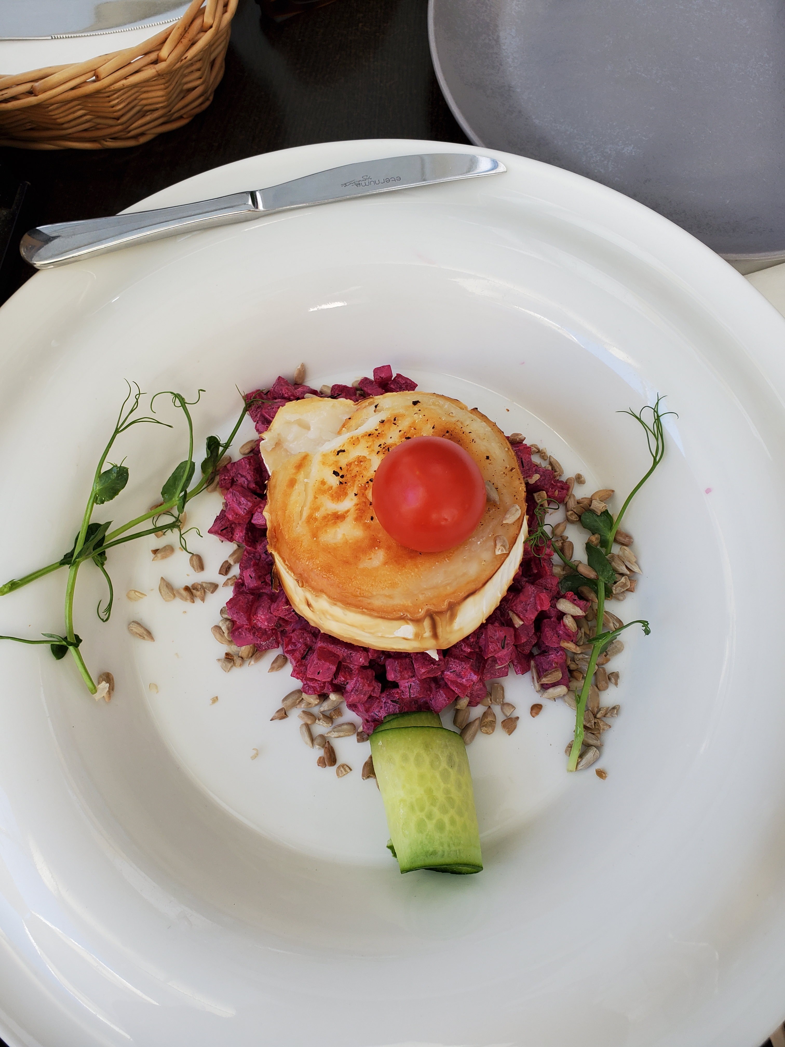 We didn’t want to eat much because we wanted to have a nice dinner on our last night in Europe, so we ordered an appetizer of baked goat cheese and roasted, marinated beets. If beets are on the menu, Betsy is going to order them, even though she’s not usually a goat cheese fan. However, this cheese was mild and delicious.