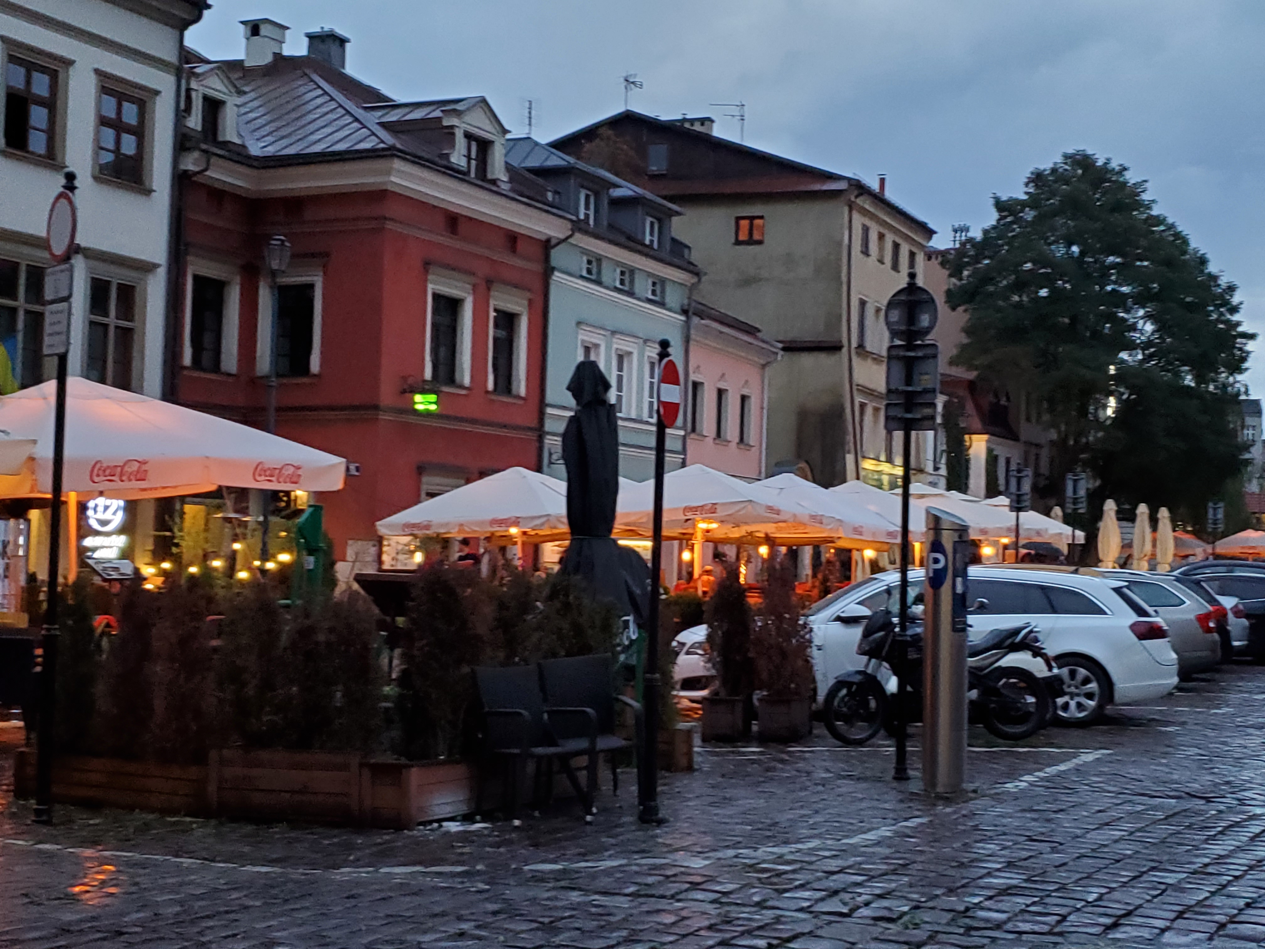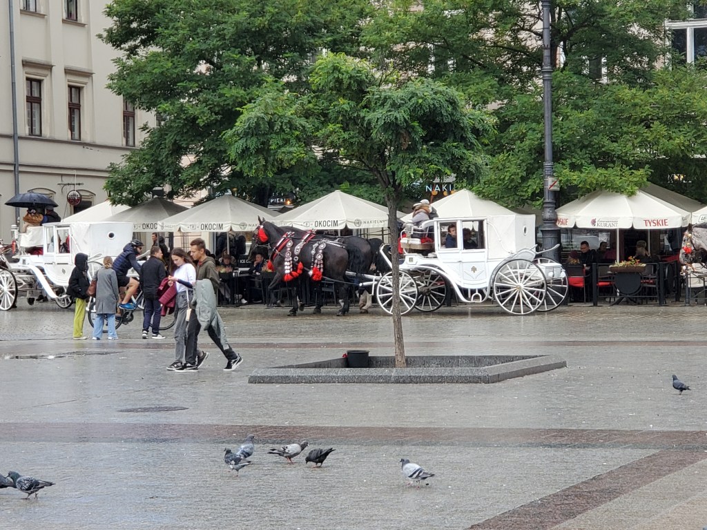 We were hungry when we arrived in Krakow, having only eaten small Kind bars for breakfast. The rain was still falling and more seemed headed our way, so we found a table under an umbrella in one of the cafes that line the square.