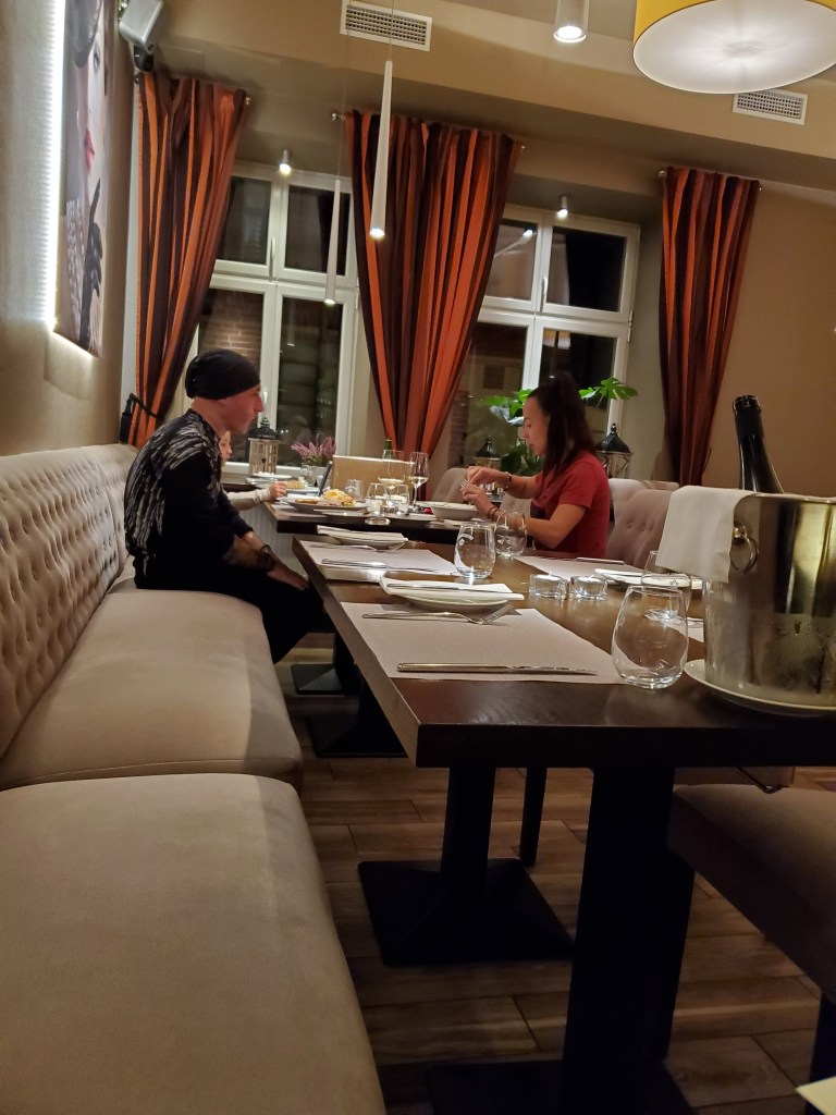 We decided to eat in the hotel restaurant, Fab Fusion. The food and the service were both excellent. We ordered pierogi and a pork dish. The plating was beautiful and both dishes were delicious. For dessert, we had a pear/apple crisp and dark chocolate creation with raspberry sauce. It was a perfect last dinner in Eastern Europe.