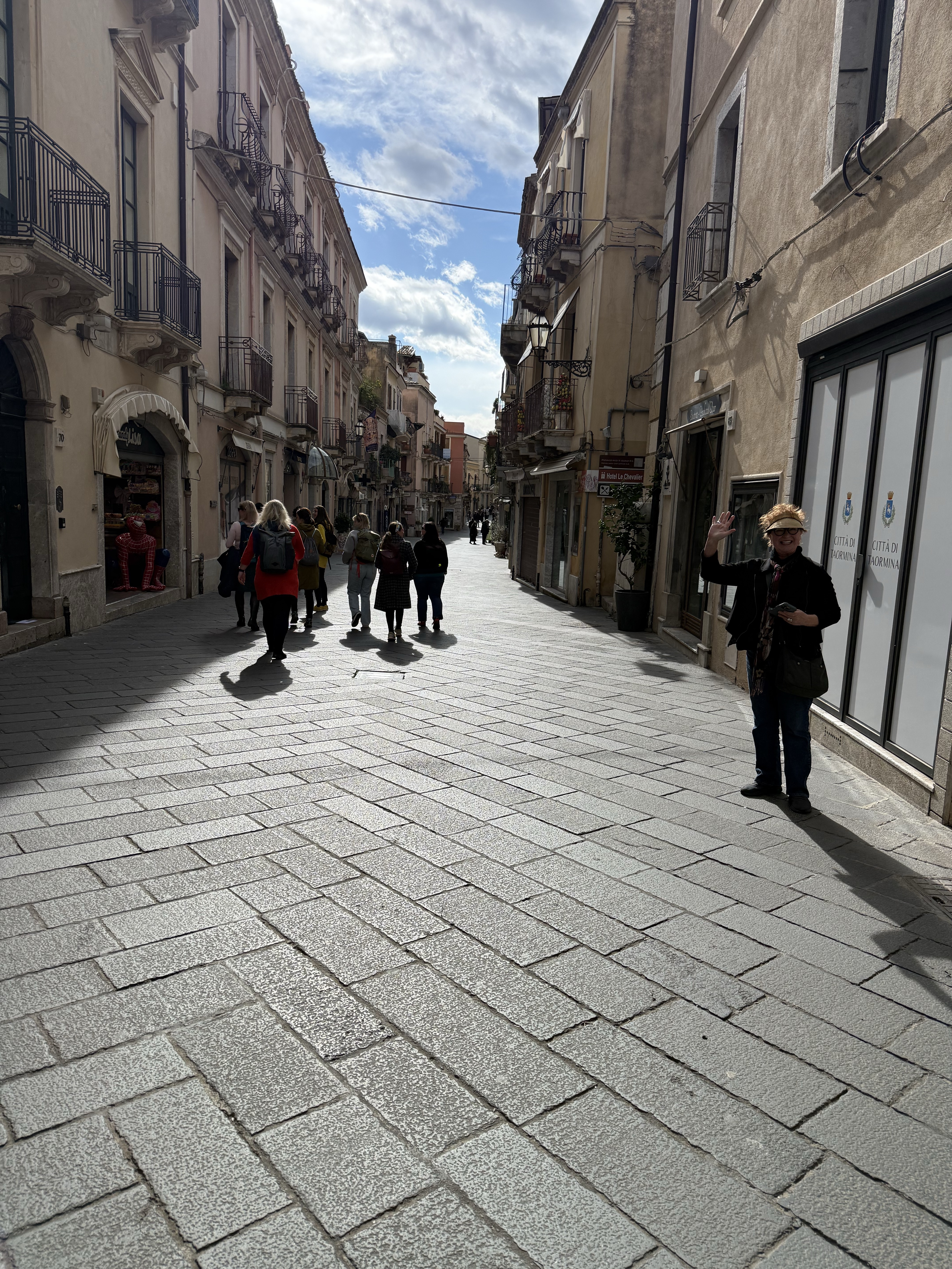 I will say this trip has been tough in some ways. The curvy roads are hard for Betsy’s vestibular system and the car rides leave her unbalanced and anxious. Betsy has never had anxiety, but the brain injury she suffered changed that. But more than that issue, she also feels a sadness about it all sometimes. Taormina is full of those side alleys with steps leading to cool shops and other interesting sites. Prior to being hit by the car, she would have been exploring all of that. I would have whined some, but not her. It breaks my heart that she doesn’t have the physical ability she once had and that she is missing out on the things she most enjoyed. Yes, she is enjoying this trip, but it is also very hard on her. The mobility scooters I rented for Madrid and here didn’t work out because they jostled her too much. She can walk and does, but there are limits for her now that didn’t exist pre-accident.