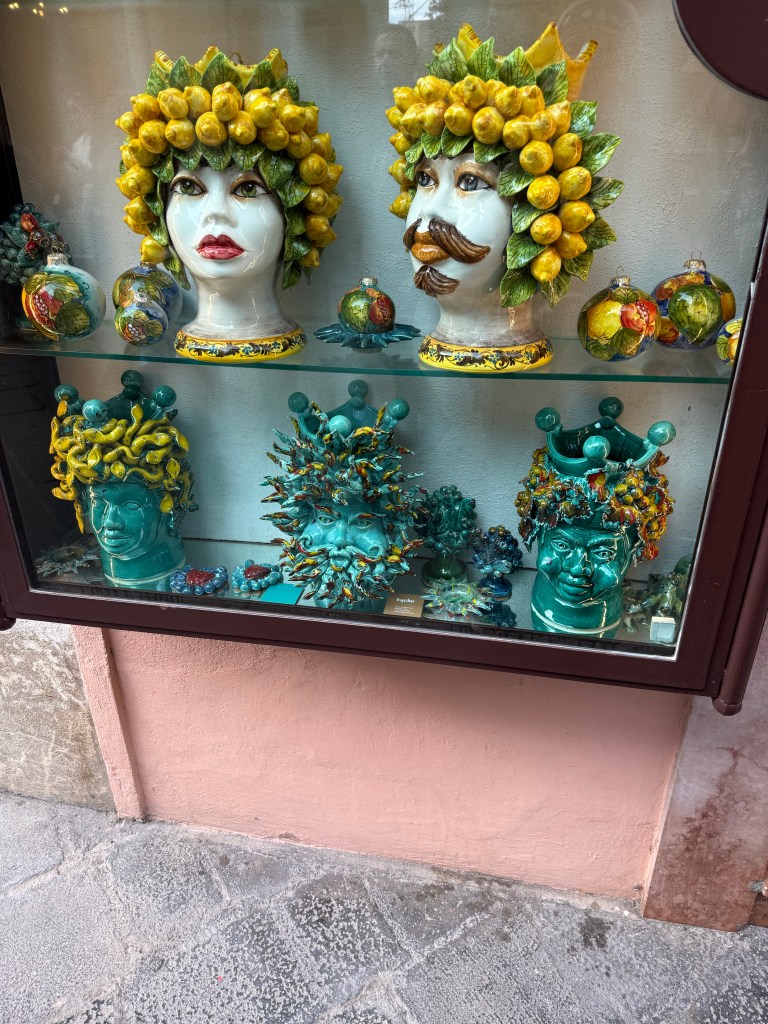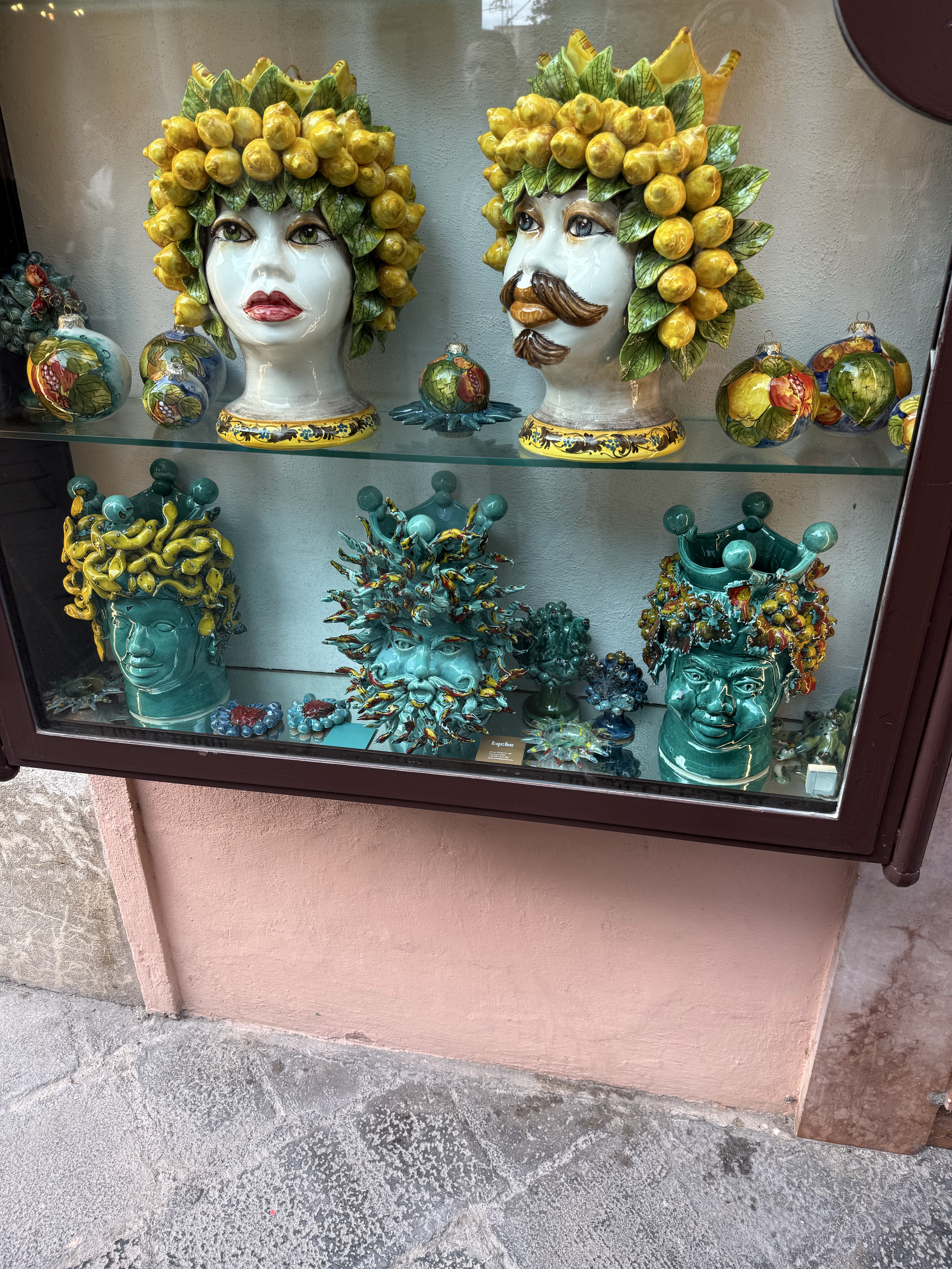 Ceramic heads like these are everywhere in Sicily. Even the house we rented is decorated with them. Teste di Moro (Moorish heads) are a traditional Sicilian art form that traces back to a legend from around the 11th century in Palermo. It’s not a pretty story. A young Sicilian woman fell in love with a Moor, discovered he would eventually leave her, and—depending on the version—killed him and turned his head into a planter, inspiring the stylized male and female heads we see today. They’re now symbols of Sicily’s passion, beauty, jealousy, and history all wrapped into one.