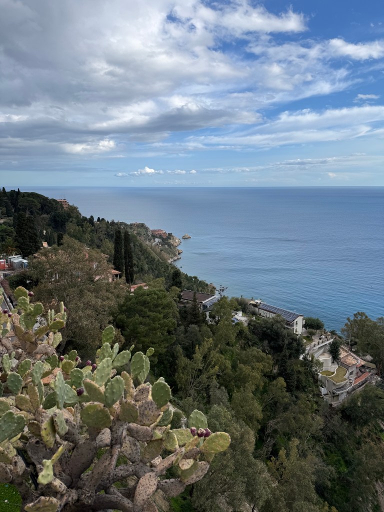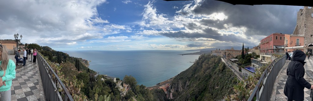 We visited one of Sicily’s most picturesque towns today, Taormina, perched atop a mountain overlooking the sea. Even though it was overcast, the views were stunning.