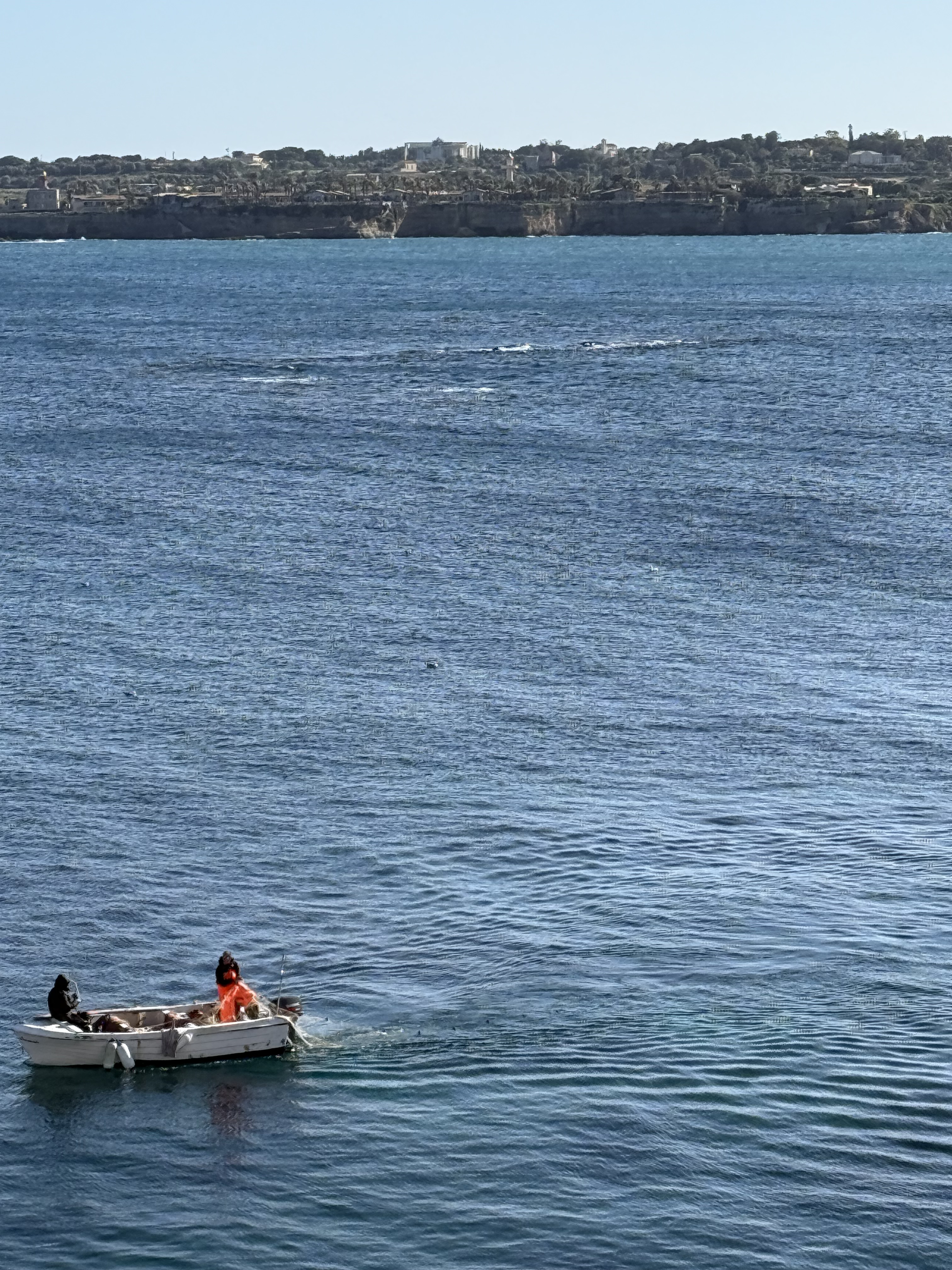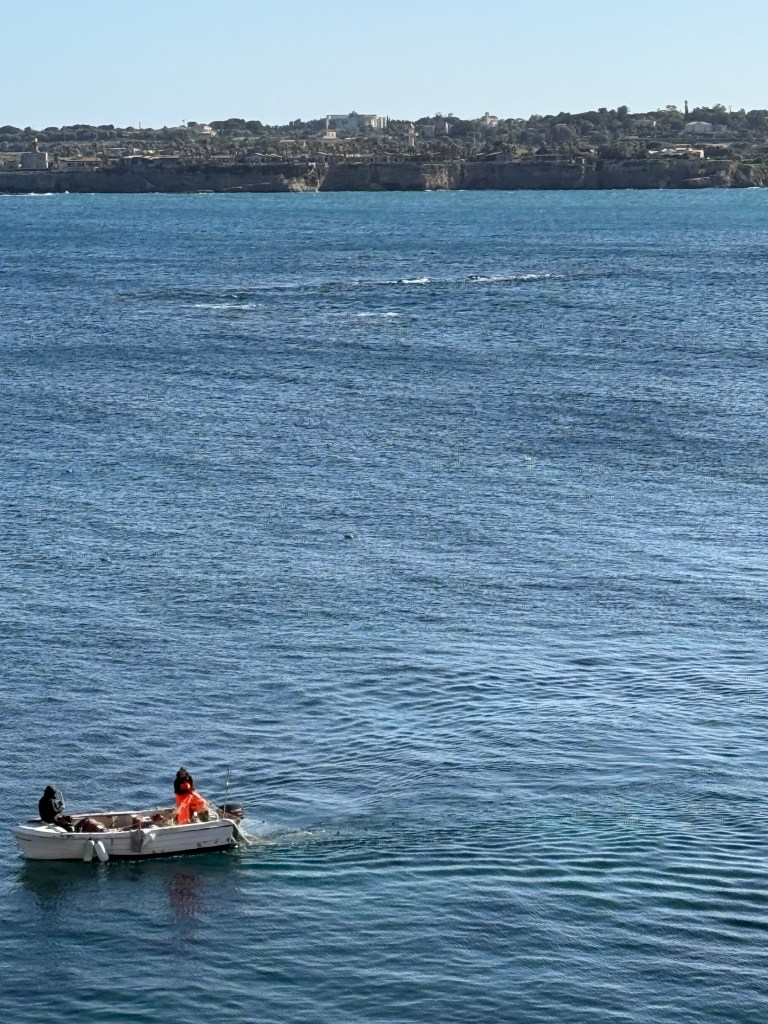 Siracusa is the larger city on Sicily’s southeast coast, with modern neighborhoods, traffic, shops, and was once one of the largest cities in the Greek world. Ortigia, by contrast, is its small historic heart — a compact island connected by bridges. The streets are narrow and limestone-colored, opening onto piazzas and the sea. The water here is that clear, layered blue, so gorgeous.