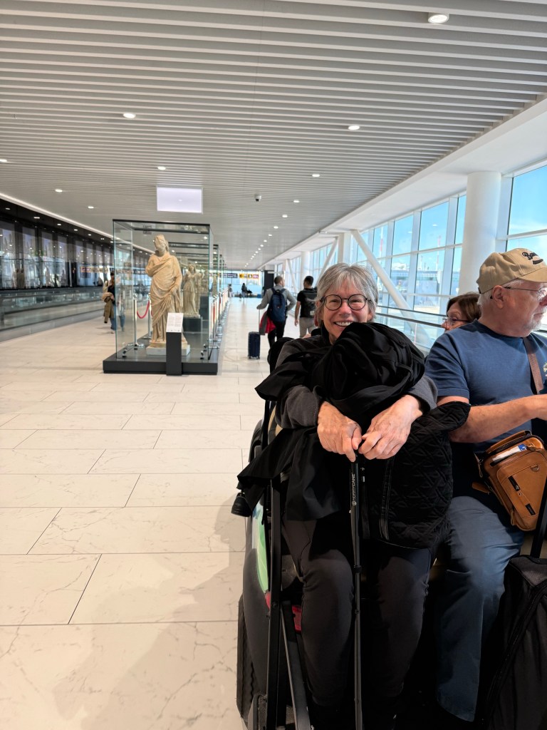 Yesterday, however, the road to Rome was fraught. We arrived at the Catania airport about 10 a.m. and checked our bags with Ryanair and planned to wait at the gate. But that’s not what they do there for people using the wheelchair service in the airport. Betsy can walk, but not for long distances carrying baggage. And, it’s more the standing for long periods, like in security lines, that is difficult for her. All that’s getting better, but we aren’t quite there yet. So, we booked assistance through the airport. At first it seemed great. They took us to a special security gate and we moved right through and then into a waiting area…where we waited…and waited…and waited.