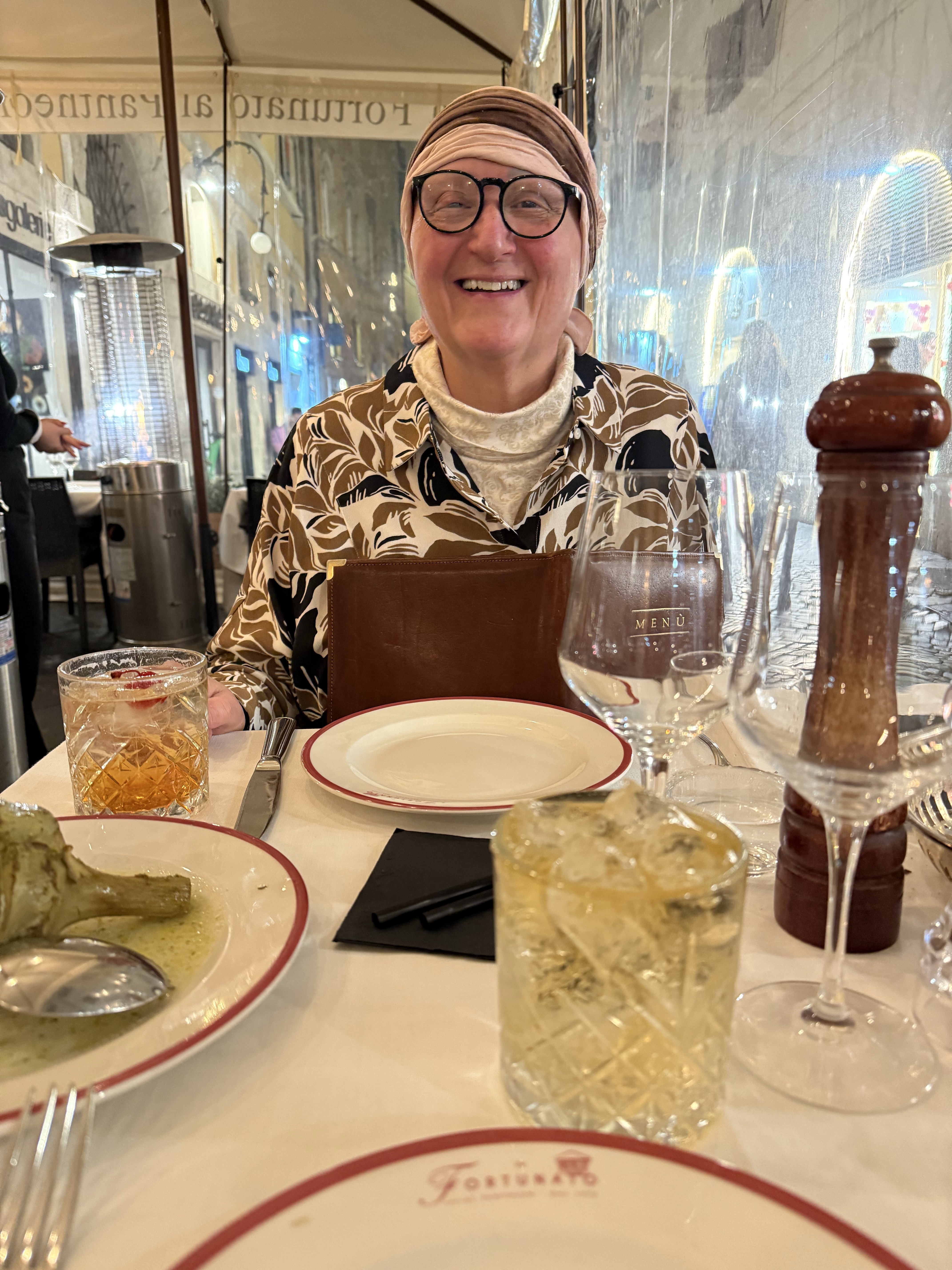 Landing in Rome was a relief. The transport service there for Betsy was flawless and even took her all the way to the car of the private driver we booked to get us to the apartment. Our driver was so nice and the ride to the apartment was a pleasure. The apartment is wonderful, just steps away from the Pantheon. The building includes a hotel and is safe and taxis are right out front, which is a big help to us this time since we’re not walking like we once did.