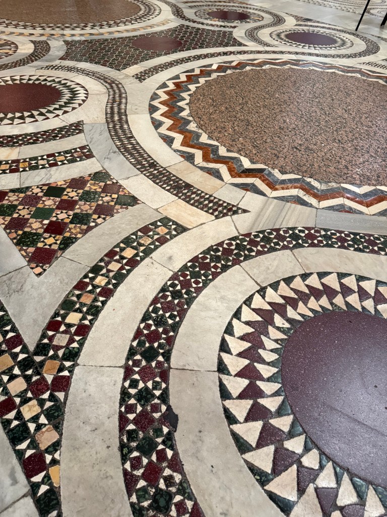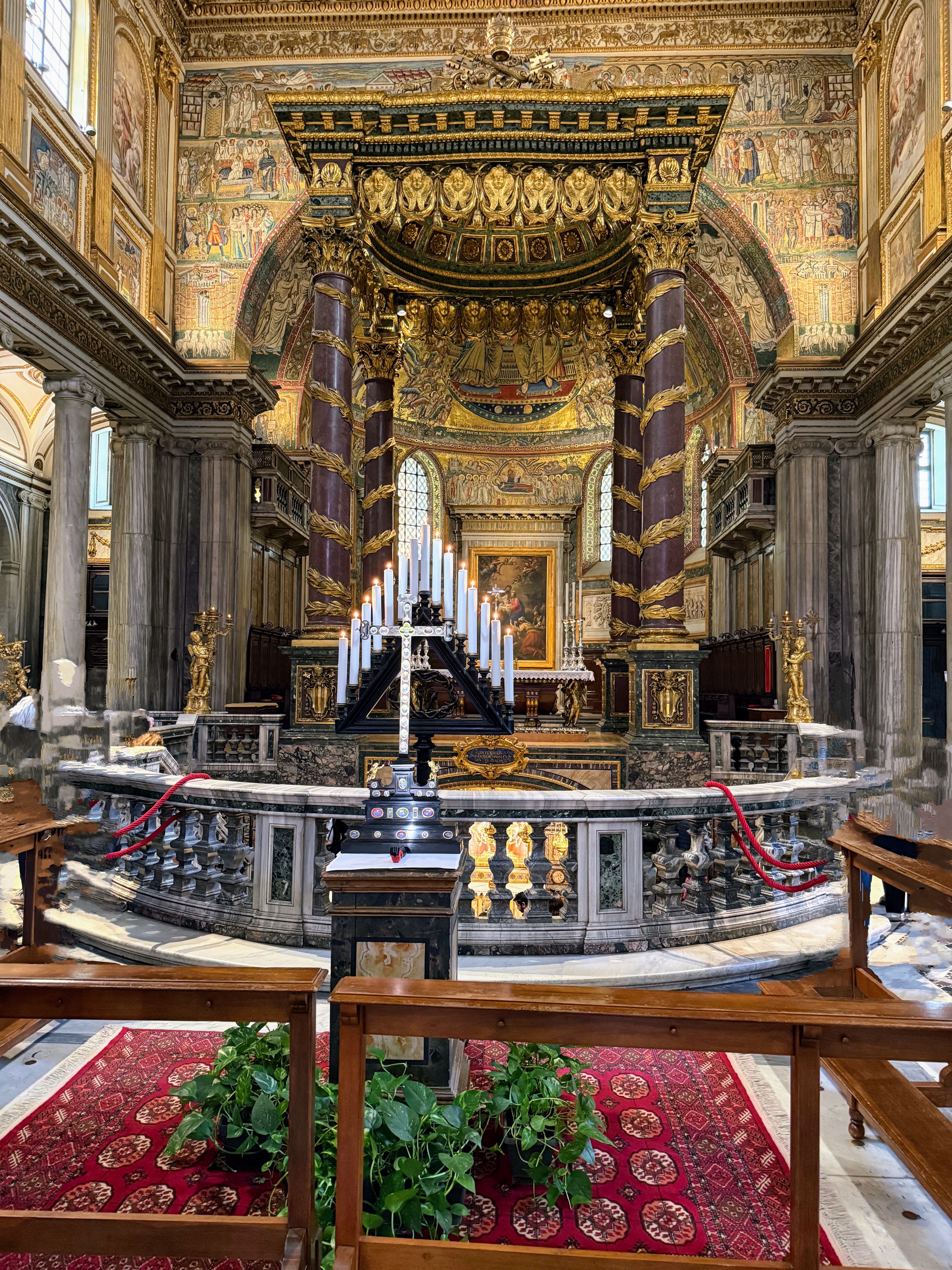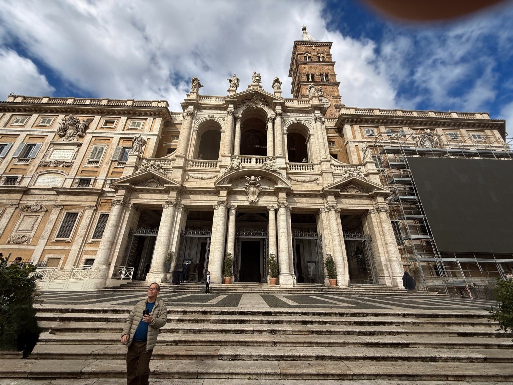 Our last day was clear and sunny and a perfect way to end this trip. We visited Santa Maria Maggiore in the morning, one of the four major papal basilicas in Rome and one of the oldest churches dedicated to the Virgin Mary in the Western world. We have visited the basilica on another trip, but it is definitely worthy of a second look. It was founded in the 5th century, shortly after the Council of Ephesus in 431 officially recognized Mary as the Mother of God. What makes this church remarkable is how much of its early structure survives. The 5th-century mosaics along the upper walls are among the oldest in Rome. The gilded coffered ceiling is said to be decorated with some of the first gold brought back from the Americas and presented to the Spanish monarchs, who then donated it to the church. According to tradition, the basilica’s location was inspired by a miraculous August snowfall in 358, and each year on August 5, white petals are dropped from the ceiling to recreate the “Miracle of the Snow.”