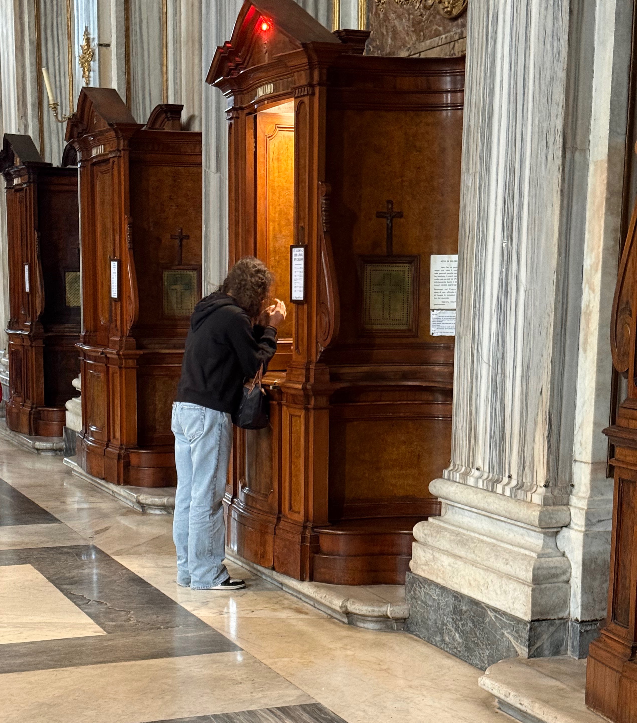 There were several confessionals open with priests speaking with people. It seemed they were saying prayers.