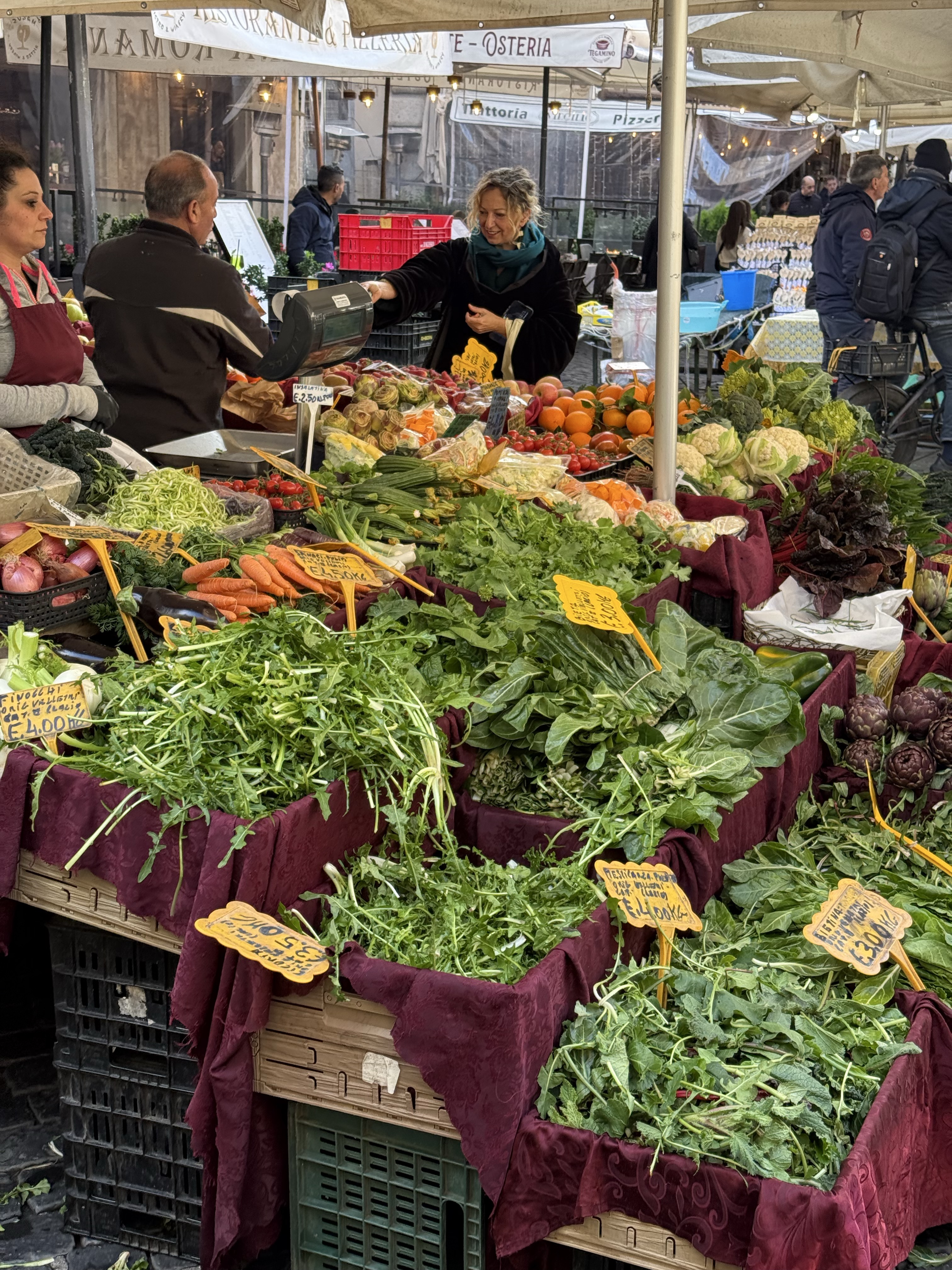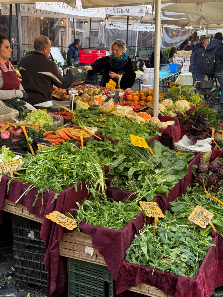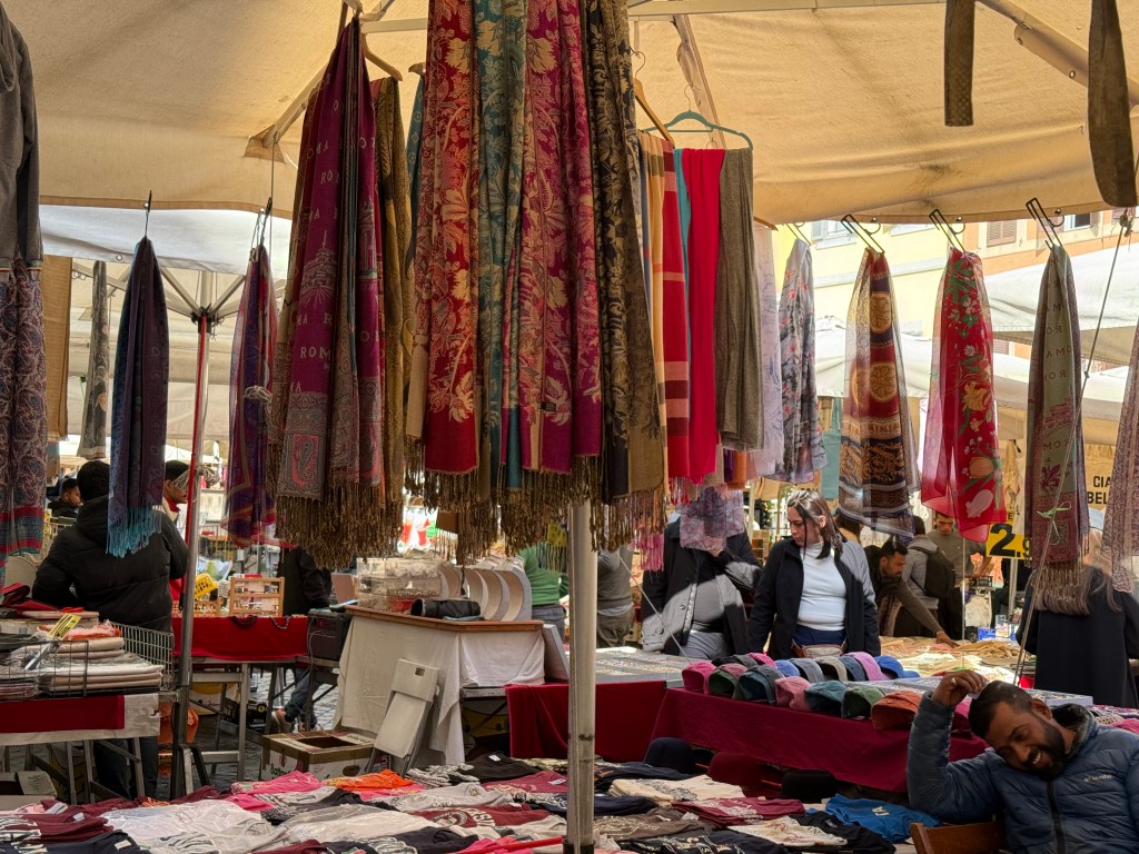 I searched for a tablecloth, but couldn’t find a shop that sold any. I did come across a street market, but no need for us to buy fruits and vegetables since we are about to go home. This market was calmer than the one at Campo di Fiori and that was really nice.