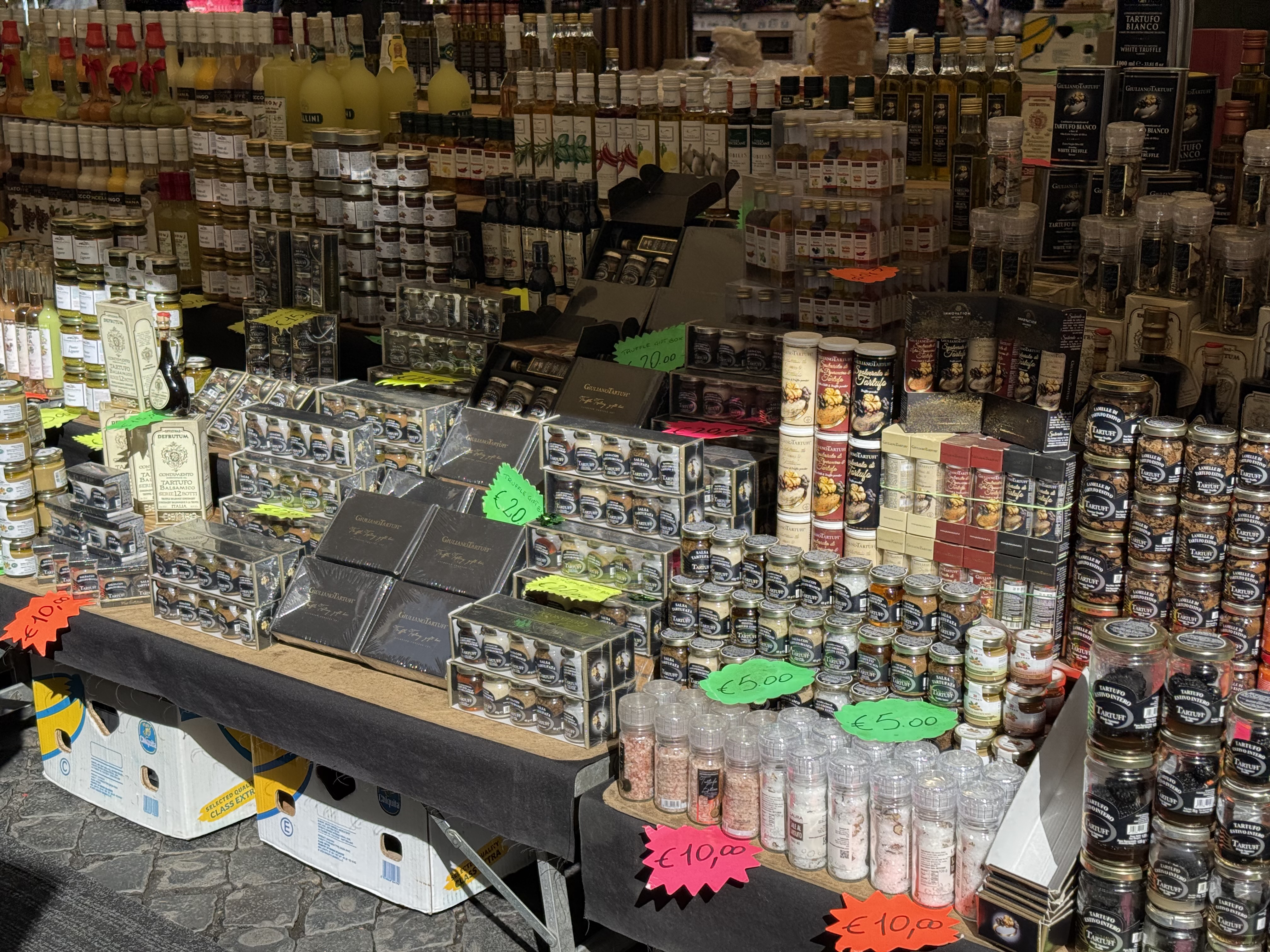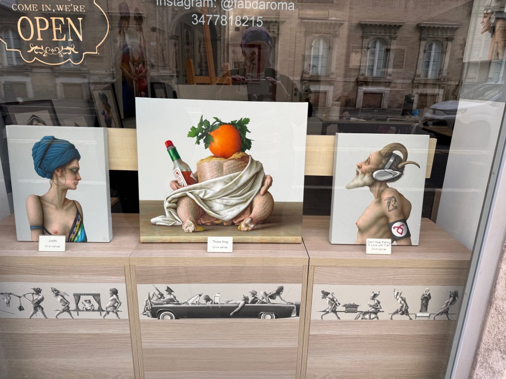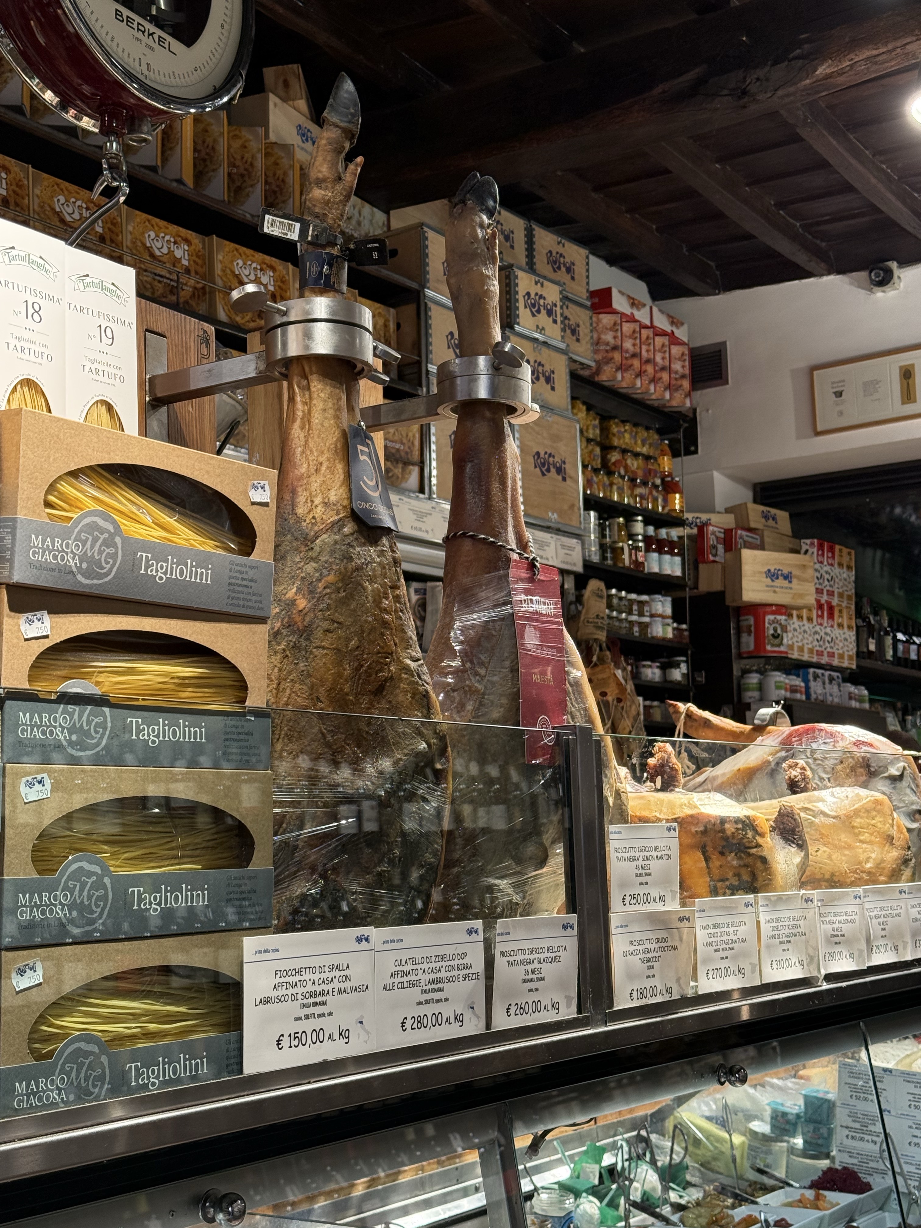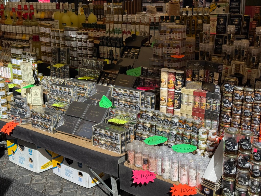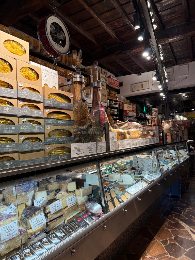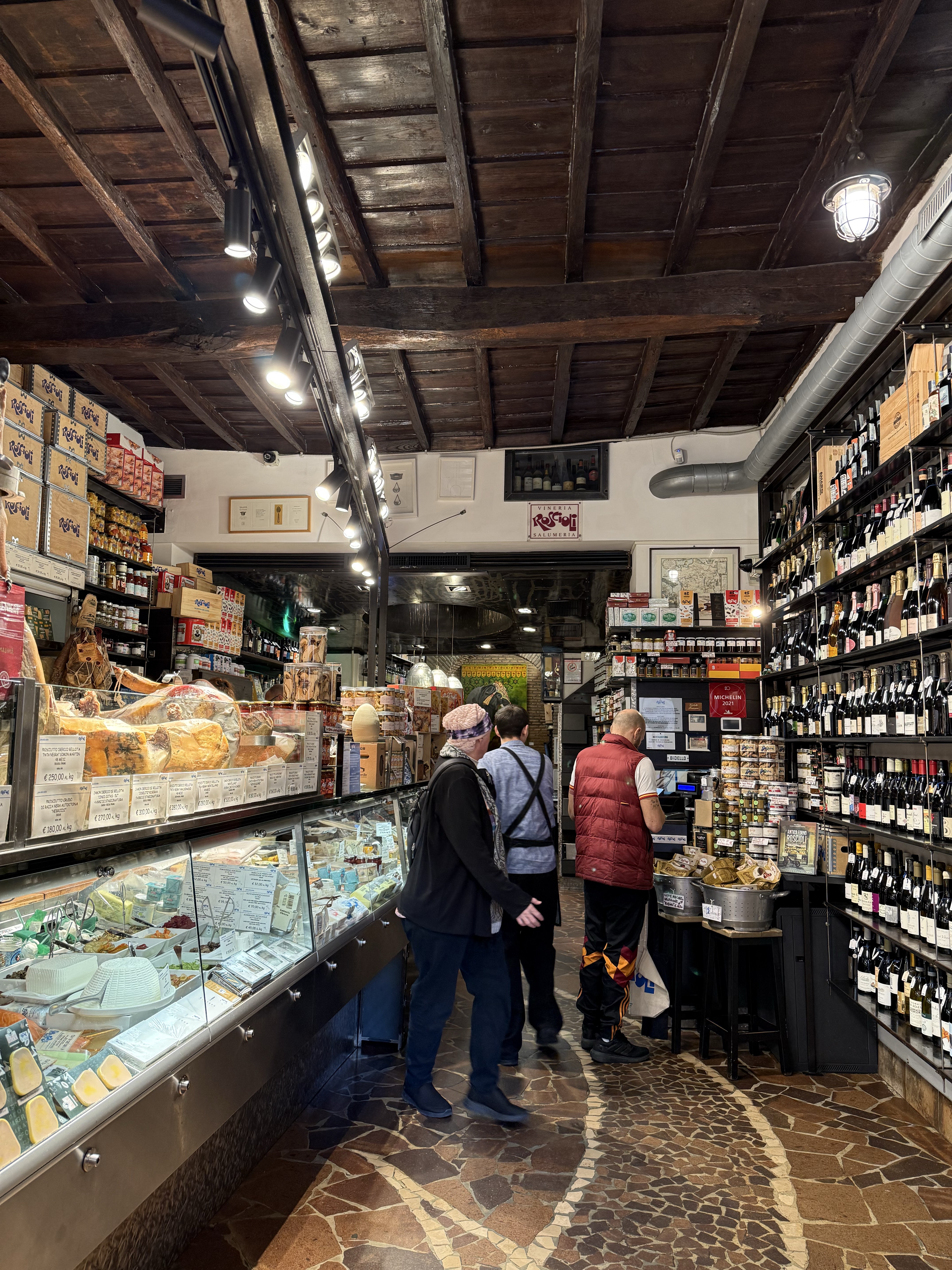 Next, we were off to the Monti district. We’ve never explored that area, which is near the Colosseum. It was bustling with a lot of young people and the narrow alleys featured some high end shops and restaurants.We found a food shop that seems to be Rome’s answer to New York’s Zabar’s. Roscioli Salumeria con Cucina has locations throughout Rome. The biggest is at Campo de’ Fiori, but we never explored much of that area because we spent a lot of time there on previous trips and the market there can be overwhelming. The Monti location was a perfect place to shop. Roscioli is a multi-generational institution that is both a world-class deli and an elite restaurant all at once. The space is lined from floor to ceiling with artisanal pastas, rare olive oils, and a massive selection of cured meats and cheeses. It is the kind of place where you can stock your pantry with the finest goods Italy has to offer, and I certainly made that attempt. Our bags are heavy with pasta sauce, olive oil and other goodies. Anyone who knows me well knows I have a condiment addiction. I gave into that and bought several jars filled with tasty spreads.