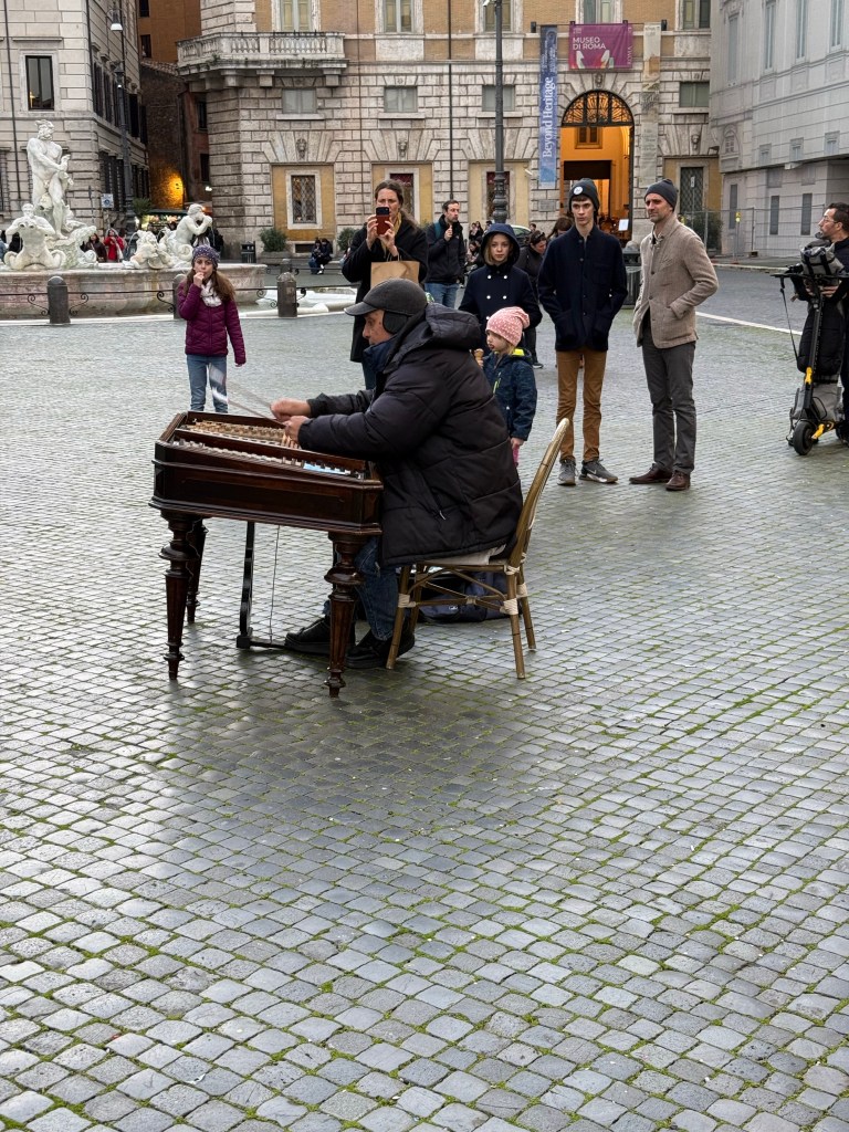 This guy was playing beautiful music in Piazza Navona. The instrument seemed like an open piano and he played the strings with mallets.